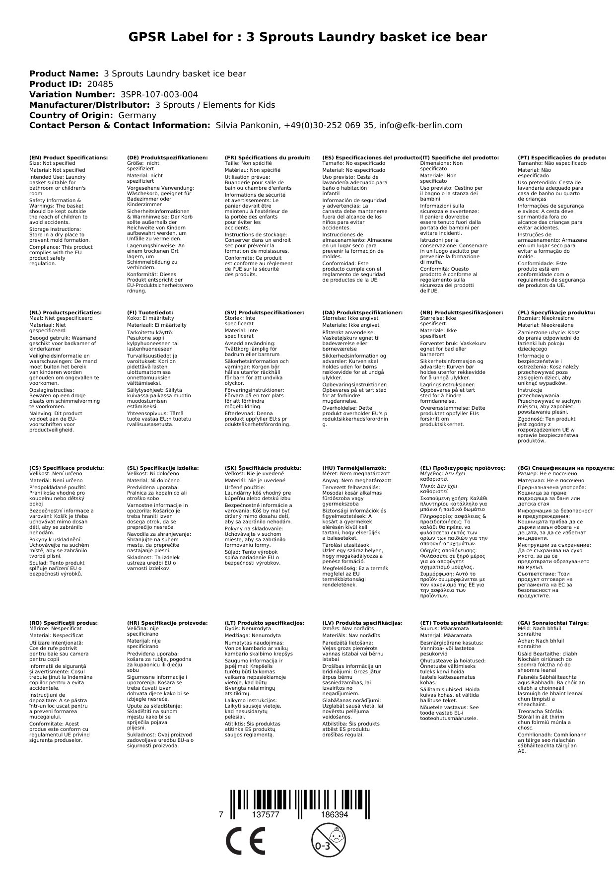 3 Sprouts Wäschekorb Eisbär