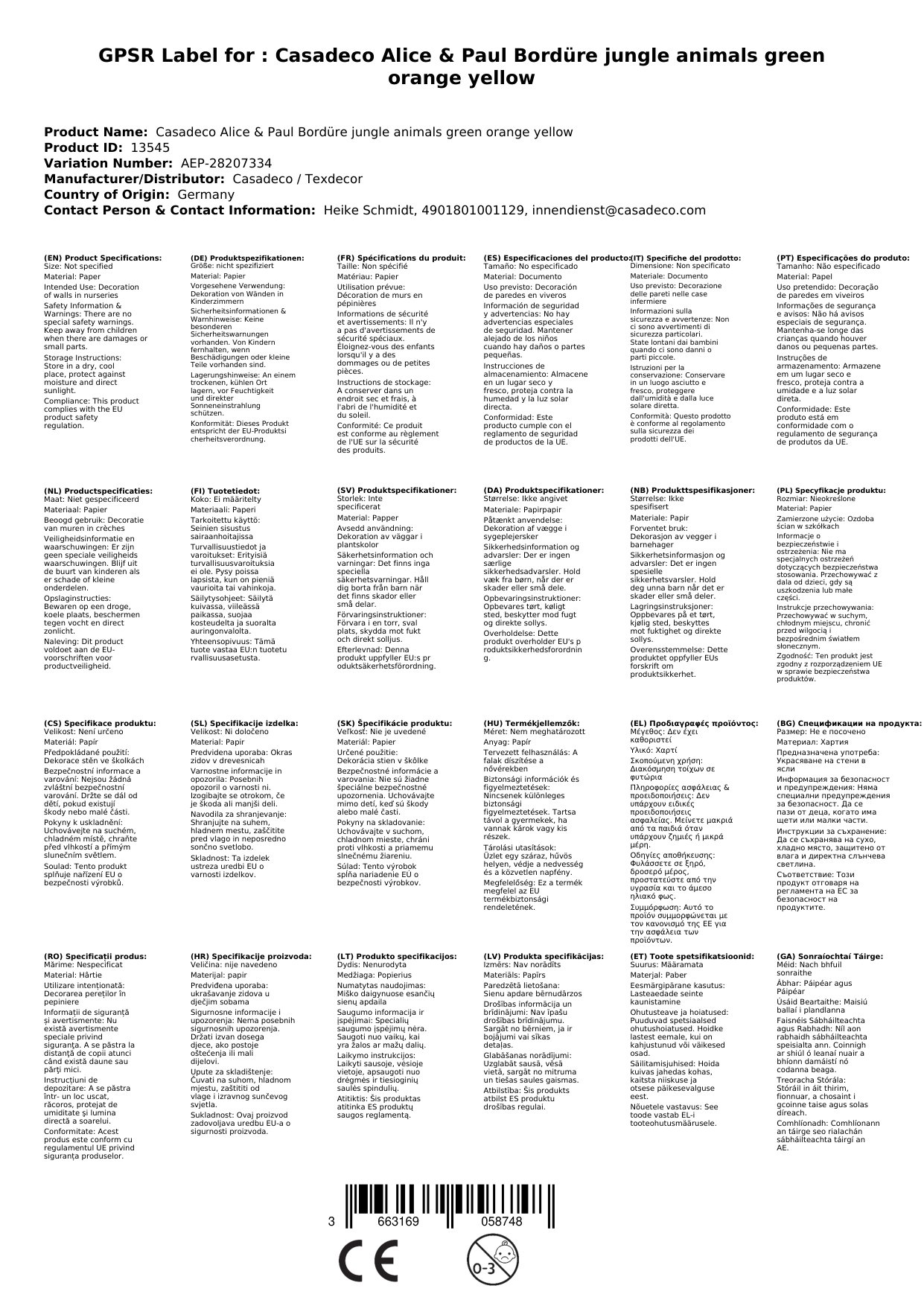 Casadeco Alice & Paul Bordüre Dschungeltiere grün orange gelb