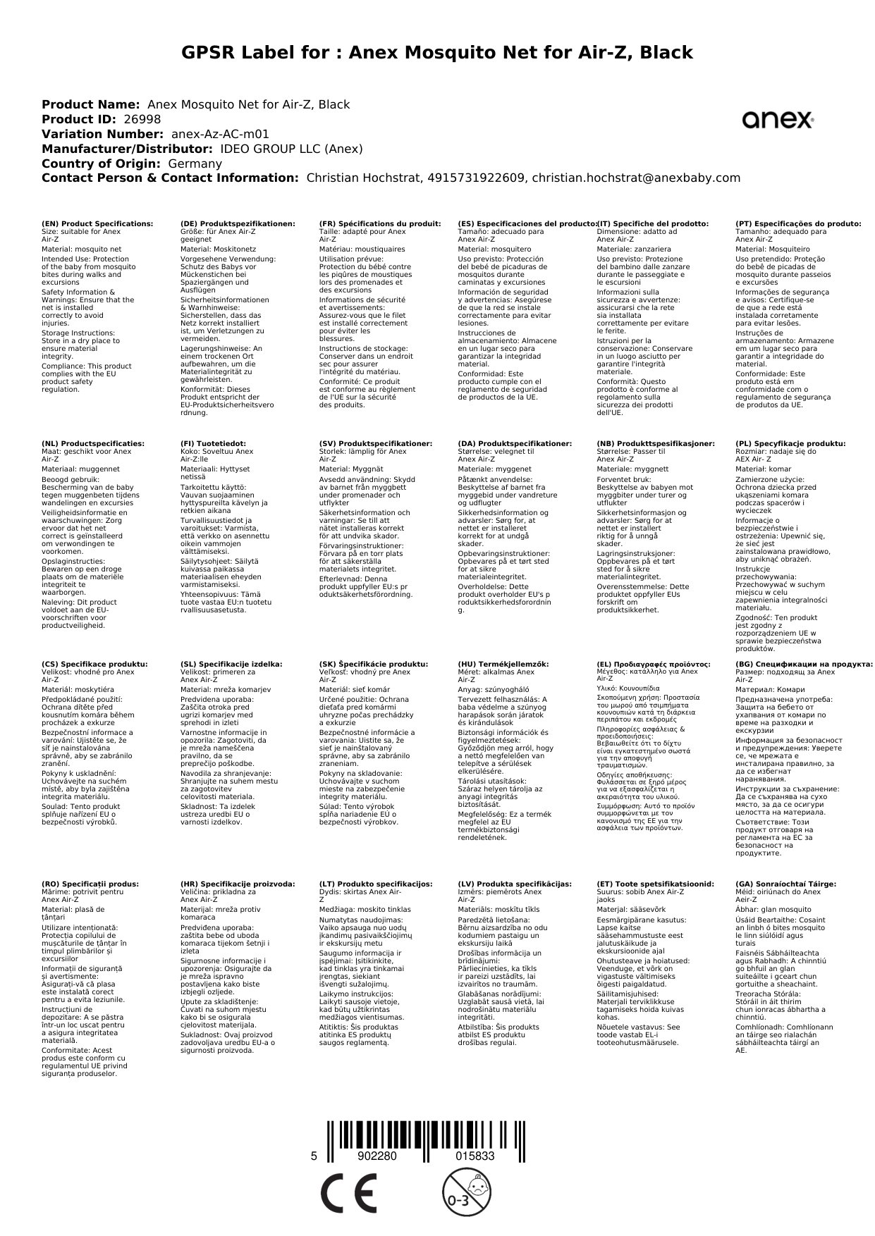 Schützt das Baby bei Spaziergängen und anderen Ausflügen vor Mückenstichen. Die Mücken haben keine Chance, Ihre Familienabenteuer zu stören. Geeignet für das Modell Anex Air-Z.