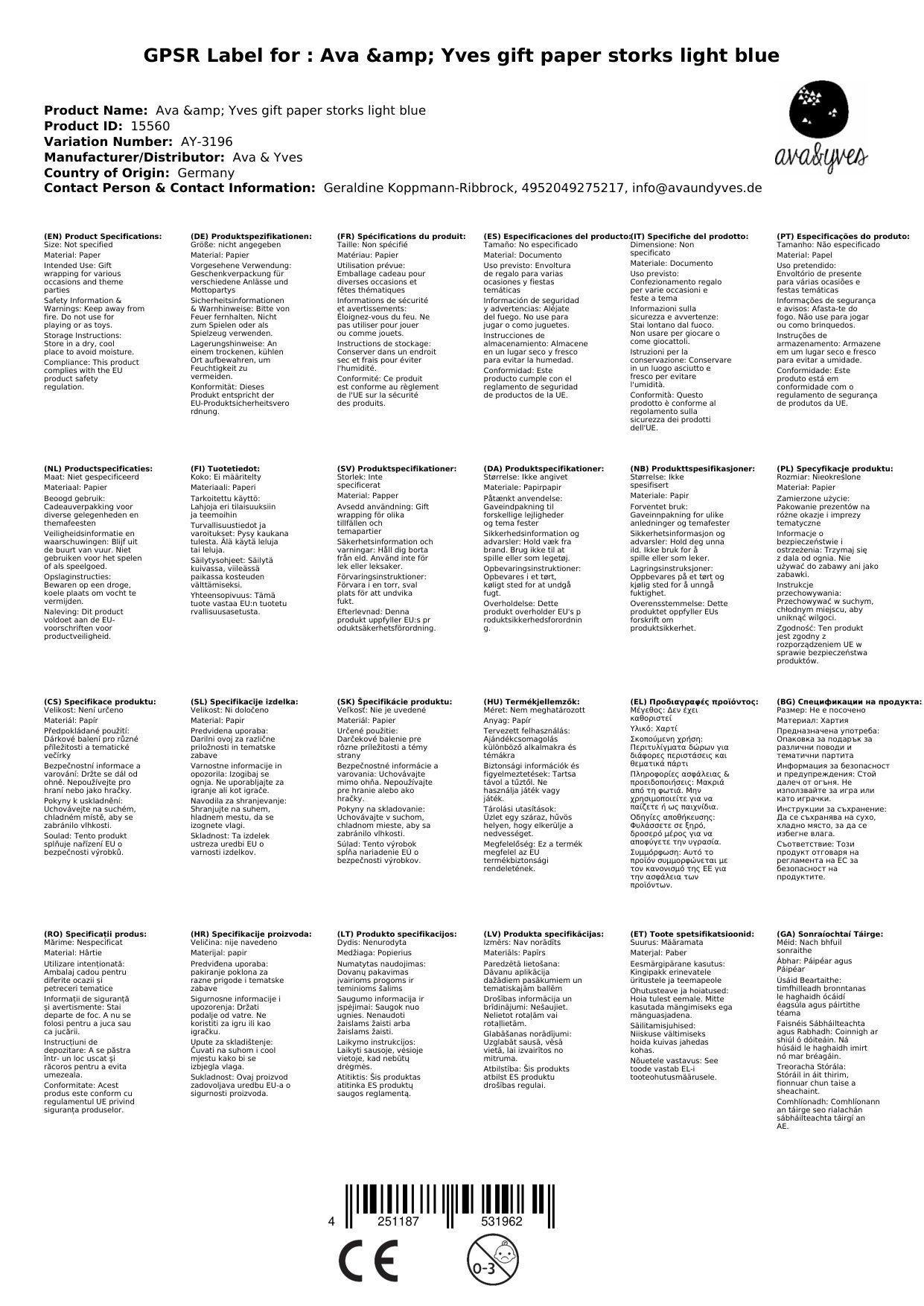 Ava & Yves Geschenkpapier Störche hellblau