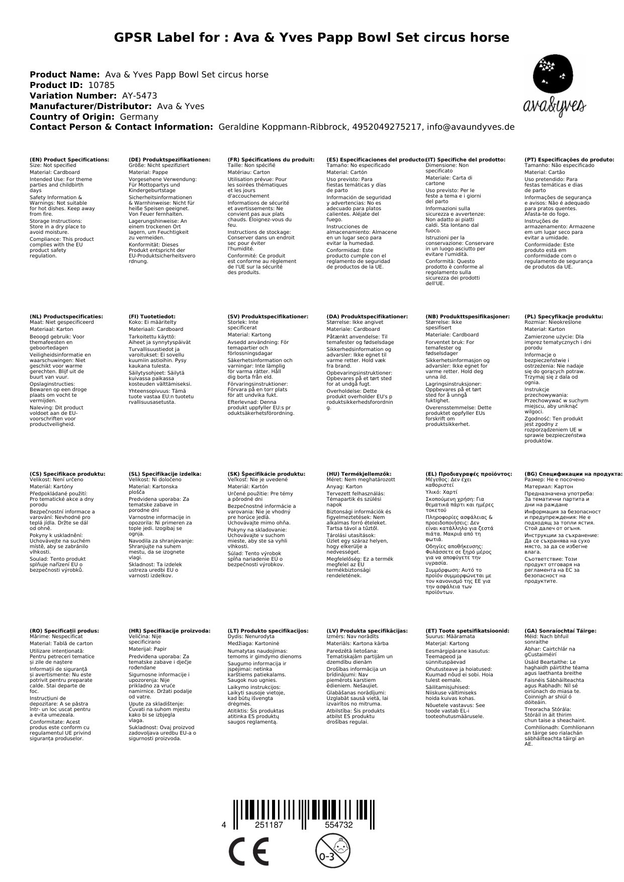 Ava & Yves Pappschale Set Zirkus Pferd