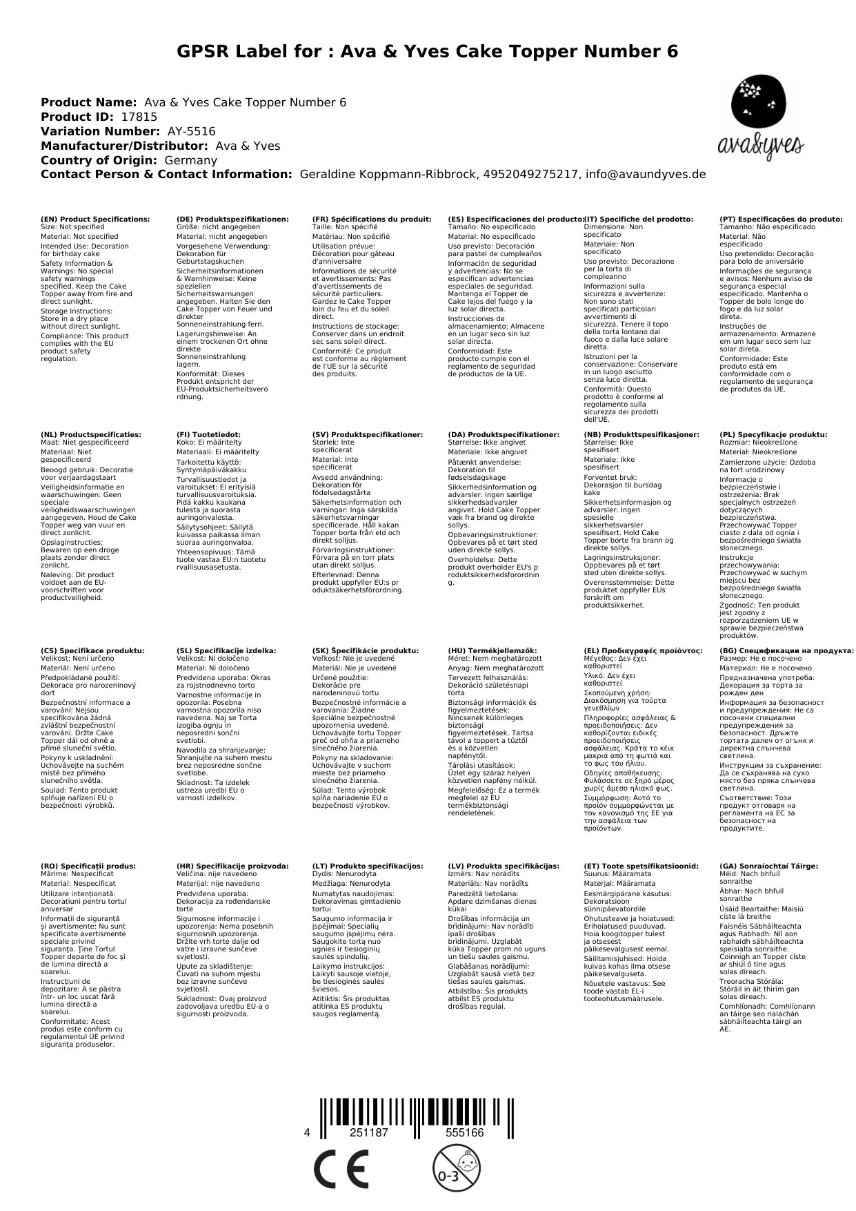 Ava & Yves Cake Topper Zahl "6"