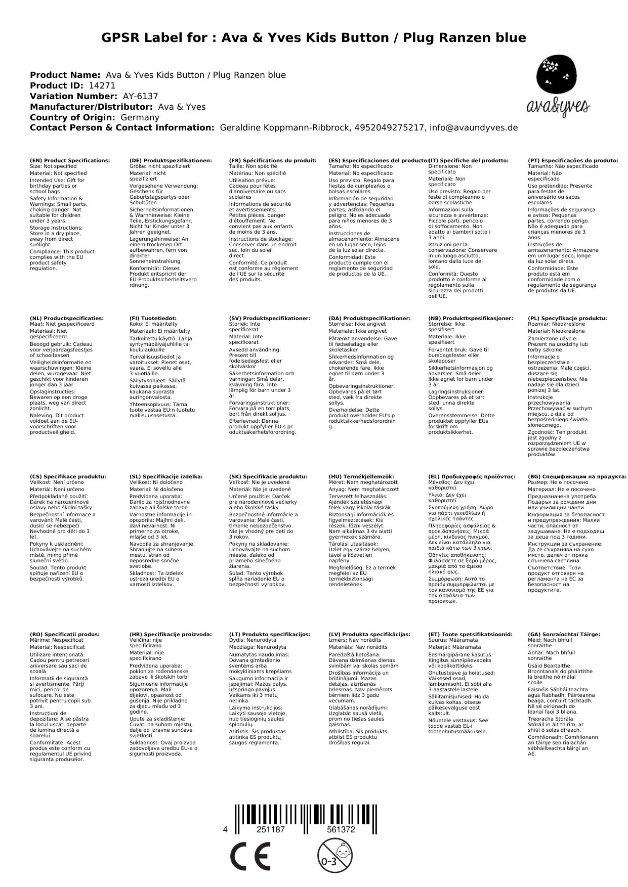 Ava & Yves Kinder Button / Anstecker Ranzen blau
