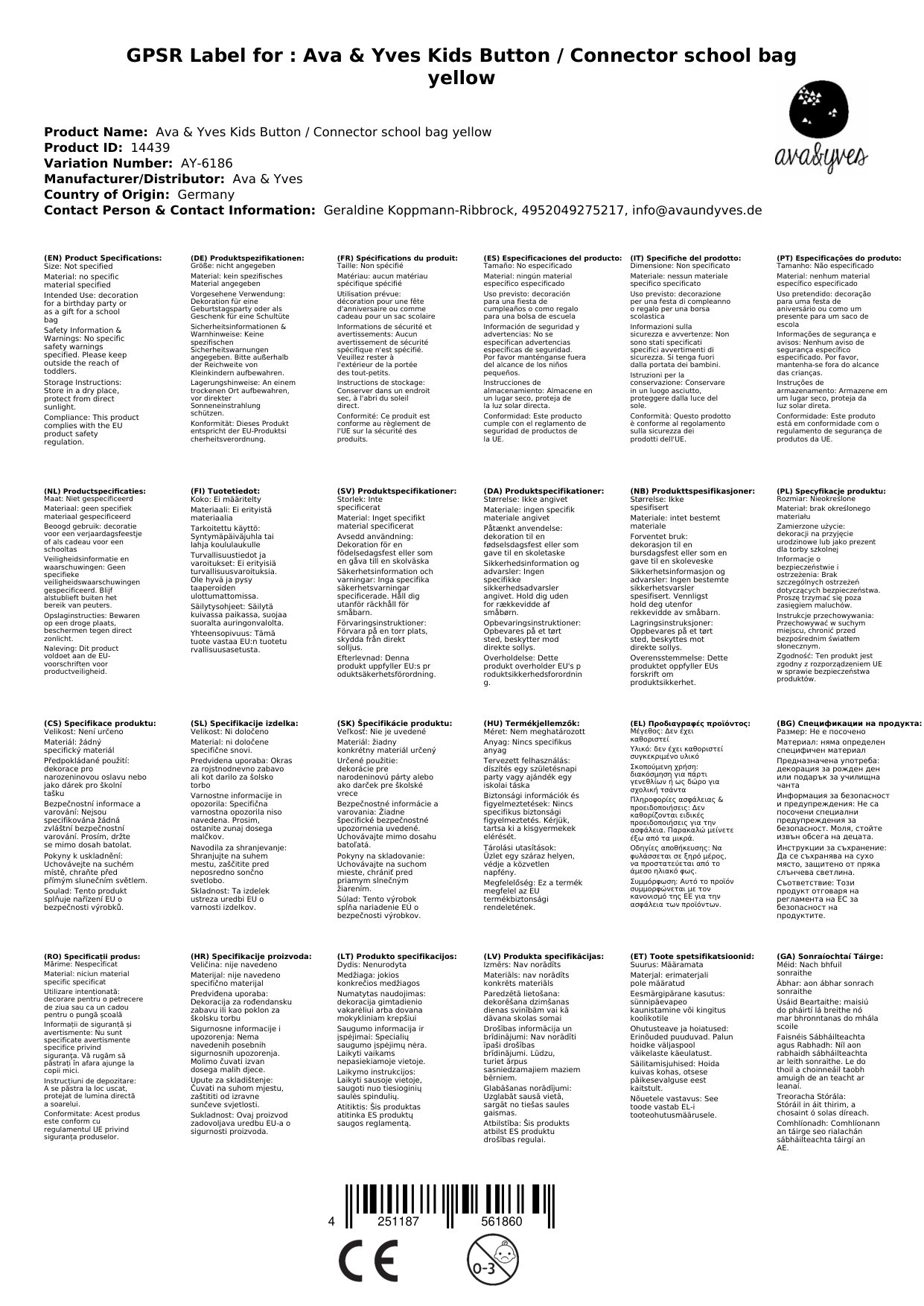 Ava & Yves Kinder Button / Anstecker Schultüte gelb