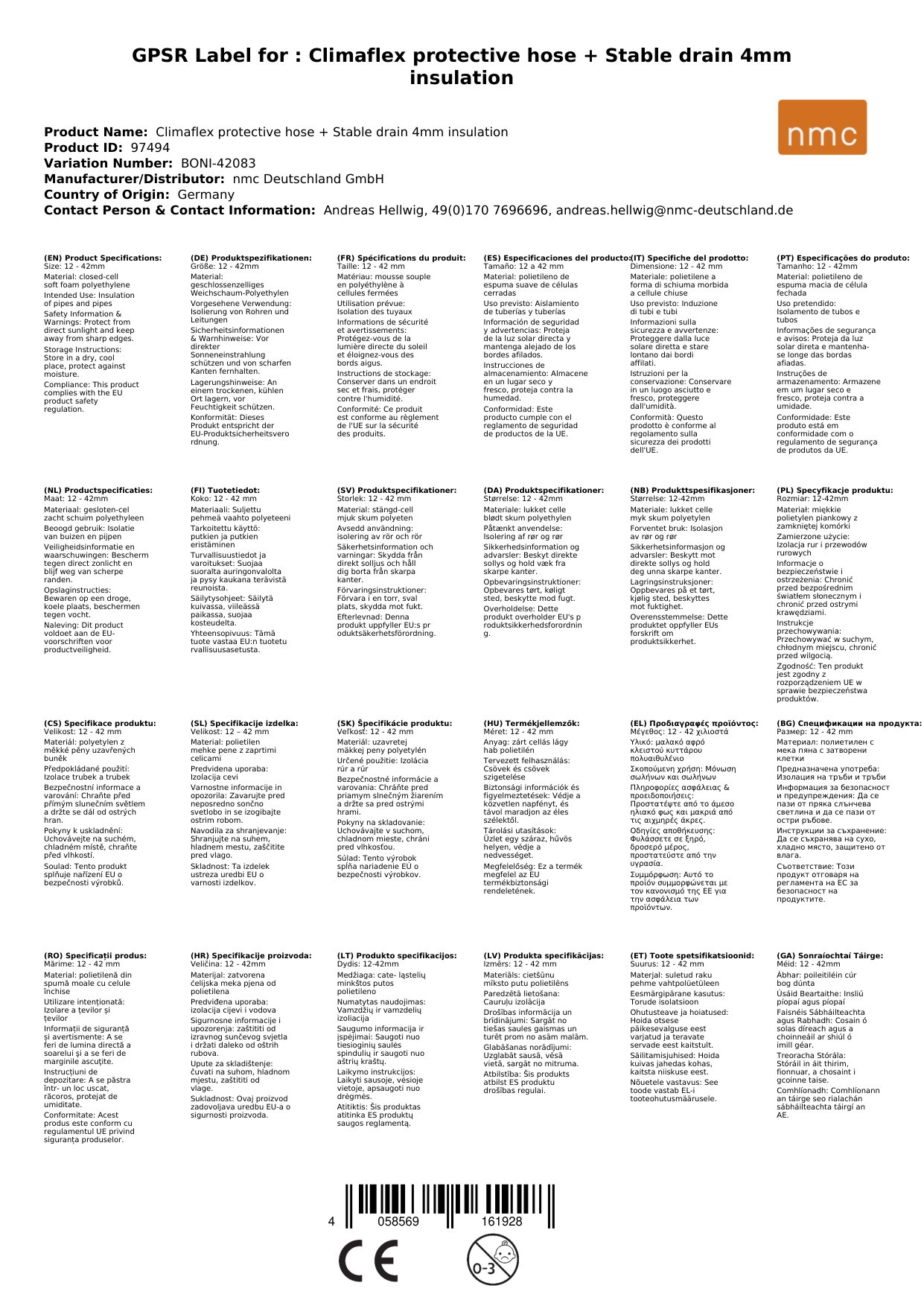 Die Rohrisolierung entspricht der Euroklasse E (EN 13501-1) und ist somit normal entflammbar. Beachten Sie die Brandschutzbestimmungen.