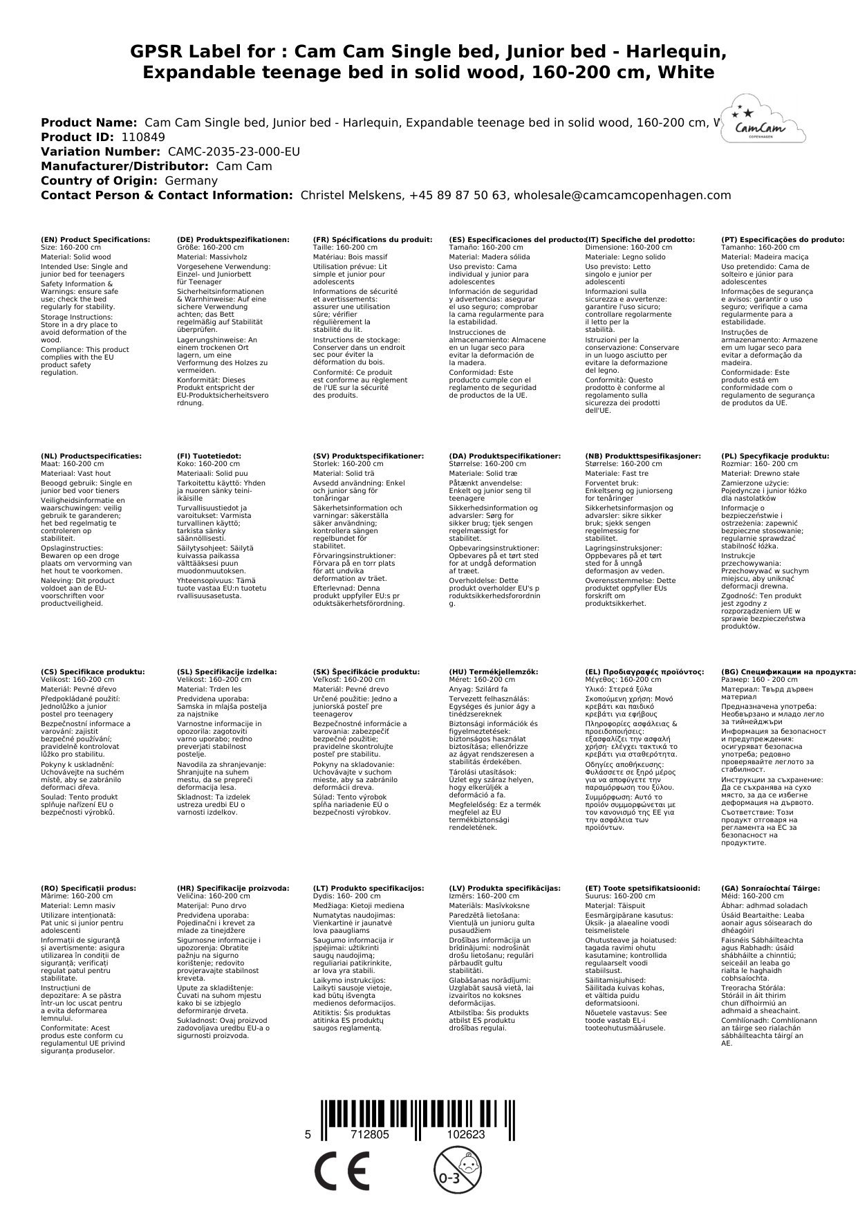 Stellen Sie eine Frage, um mehr über das Produkt zu erfahrenCam Cam Einzelbett, Juniorbett - Harlequin, Erweiterbares Teenager Bett aus Massivholz, 160-200 cm, Weiß