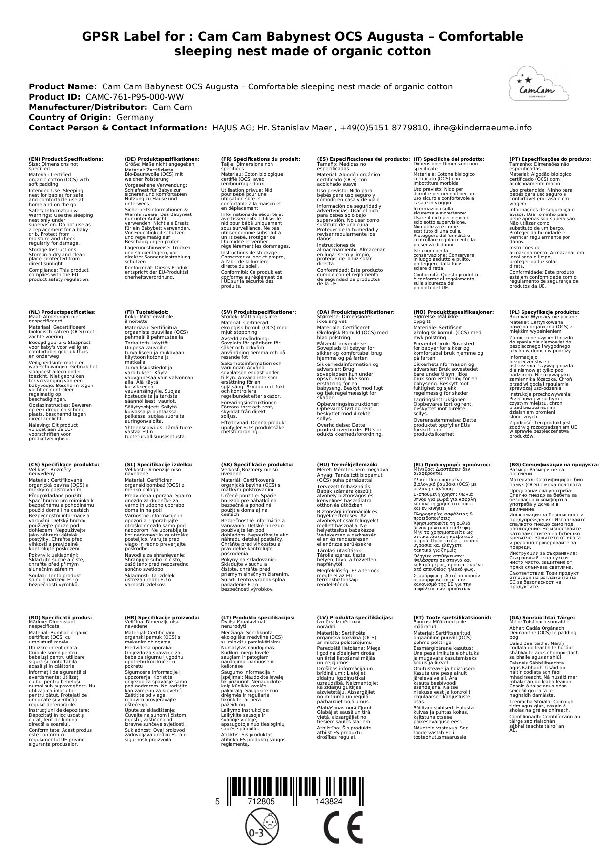 Das Cam Cam Babynest Augusta ist speziell für Neugeborene konzipiert und bietet einen sicheren und gemütlichen Schlafplatz. Hergestellt aus 100% zertifizierter Bio-Baumwolle nach dem OCS (Organic Content Standard) garantiert es höchste Hautverträglichkeit und ein angenehmes Gefühl. Die weiche, aber dennoch stützende Polsterung sorgt für eine beruhigende Nestchen-Atmosphäre, die Ihr Baby lieben wird. Dank seiner kompakten Maße und des geringen Gewichts ist es ideal für unterwegs und lässt sich leicht transportieren, sodass Ihr Kind überall seinen vertrauten Schlafplatz hat. Die durchdachte Konstruktion unterstützt eine sichere Liegeposition.