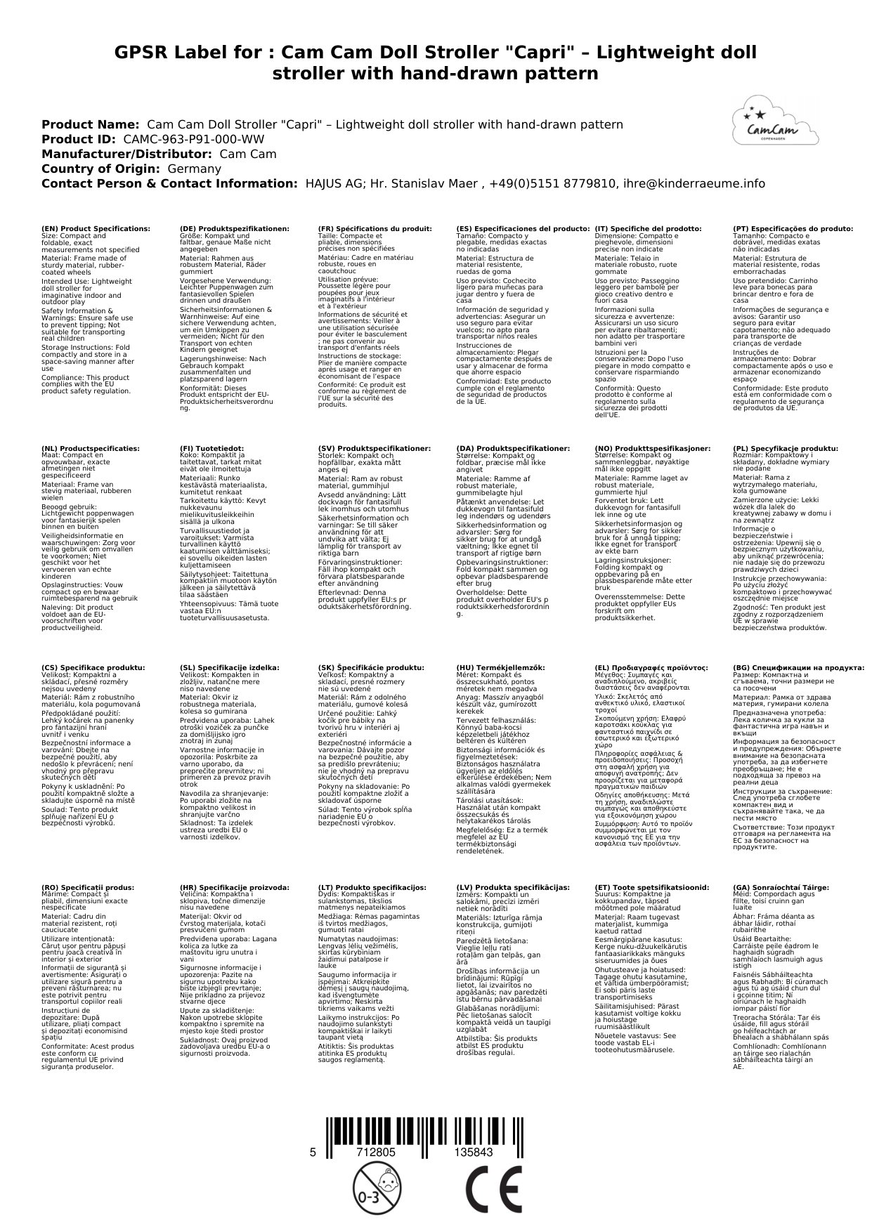 Entdecken Sie den bezaubernden Cam Cam Puppen-Kinderwagen "Capri" – Ihr perfekter Begleiter für fantasievolles Spielen. Dieser leichte Puppenwagen kombiniert ein einzigartiges, handgezeichnetes Muster mit robustem, kinderleichtem Design. Dank seiner cleveren Faltfunktion und der gummibereiften Räder ist er nicht nur praktisch, sondern auch stilvoll. Erleben Sie stundenlangen Spielspaß drinnen und draußen mit diesem wunderschönen Spielzeugkinderwagen.
