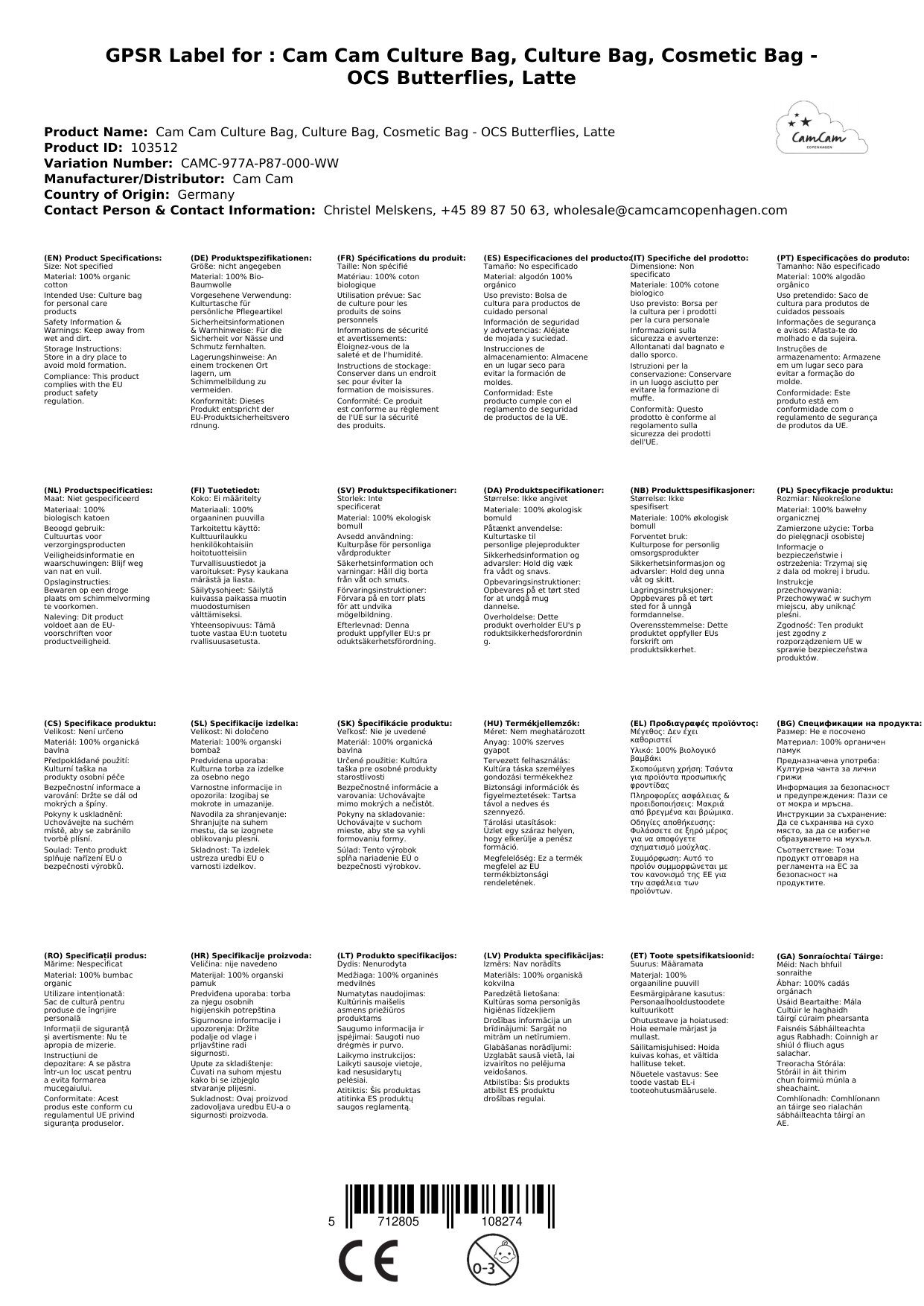 Cam Cam Kulturbeutel, Kulturtasche, Kosmetiktasche - OCS Schmetterlinge, Latte