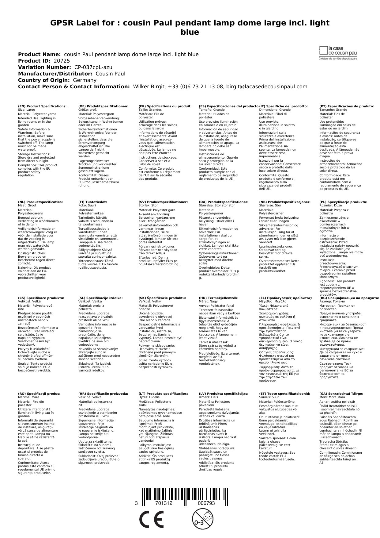 Cousin Paul Pendellampe Kuppel gross inkl. Fassung hellblau
