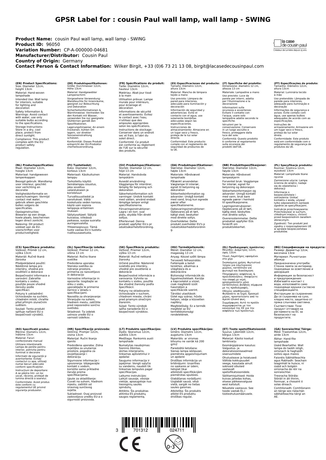 Stellen Sie eine Frage, um mehr über das Produkt zu erfahrenCousin Paul Wandleuchte, Wandlampe - SWING