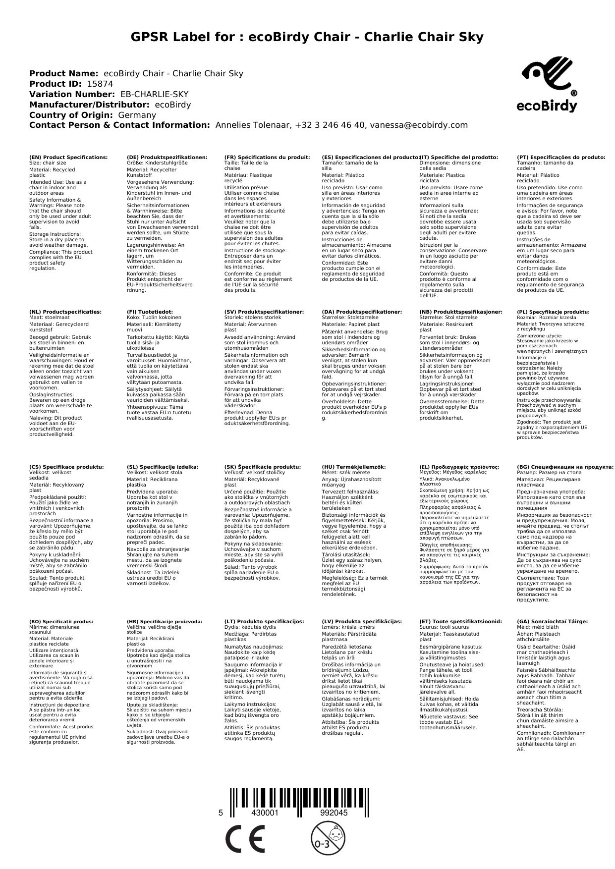 Nachhaltigkeit: Der Kinderstuhl wird aus recyceltem Kinderspielzueg hergestellt. In aufwendigen Verfahren wird das Plastikspielzeug gesammelt, sortiert, geprüft und anschliessend zu Granulat verarbeitet. aus diesem werden die fabelhaften Möbel und Accessoires von ecoBirdy hergestellt. Die Produkte sind als nicht nur nachhaltig, sondern schonen auch Umwelt und damit auch uns.