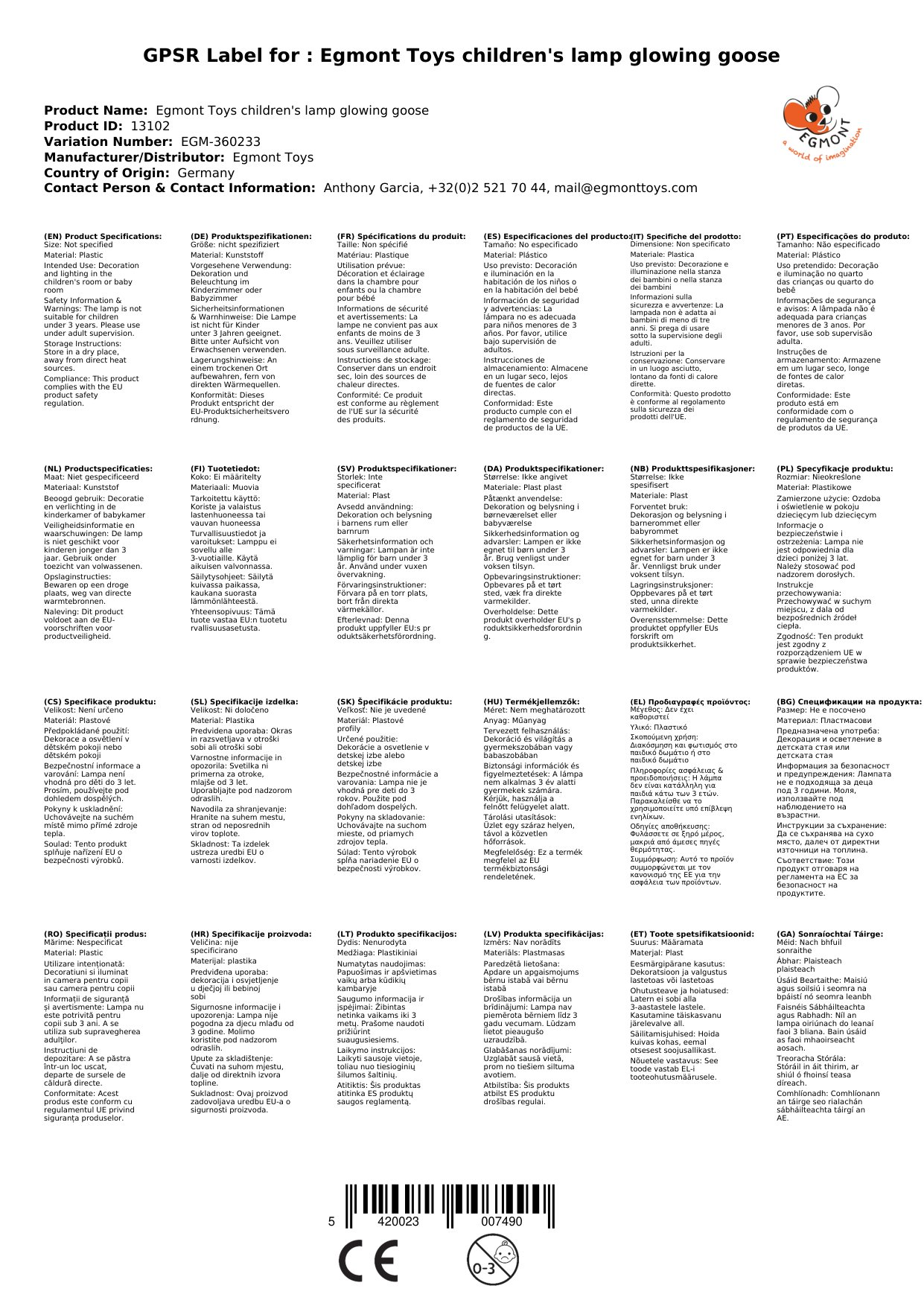 Egmont Toys Kinderlampe leuchtende Gans