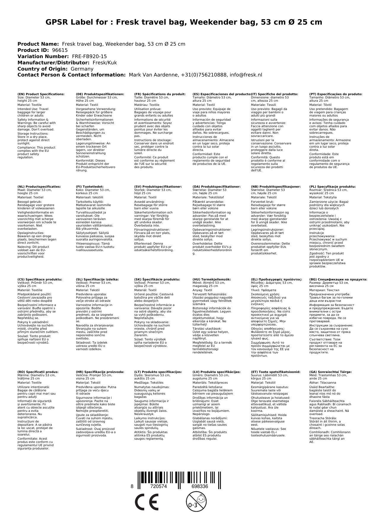 Die Fresk Reisetasche, mit einem Durchmesser von 53 cm und einer Höhe von 25 cm, ist der perfekte Begleiter für größere Kinder oder Erwachsene auf Reisen. Zusammen mit der Reisetasche für Kinder im Partnerlook wird das Reiseerlebnis gleich doppelt so aufregend! Hergestellt aus recycelten PET-Flaschen, ist sie nicht nur umweltbewusst, sondern auch nachhaltig.