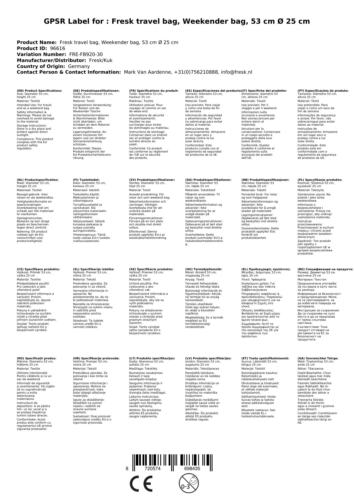 Die Fresk Reisetasche, mit einem Durchmesser von 53 cm und einer Höhe von 25 cm, ist der perfekte Begleiter für größere Kinder oder Erwachsene auf Reisen. Zusammen mit der Reisetasche für Kinder im Partnerlook wird das Reiseerlebnis gleich doppelt so aufregend! Hergestellt aus recycelten PET-Flaschen, ist sie nicht nur umweltbewusst, sondern auch nachhaltig.