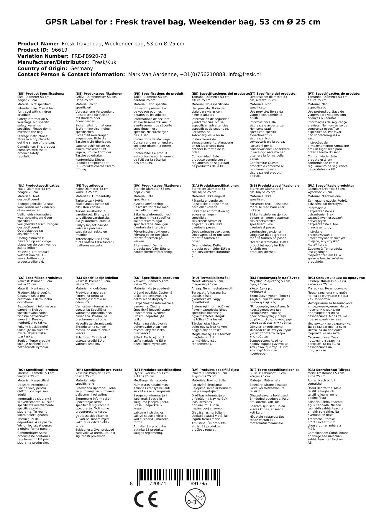 Die Fresk Reisetasche, mit einem Durchmesser von 53 cm und einer Höhe von 25 cm, ist der perfekte Begleiter für größere Kinder oder Erwachsene auf Reisen. Zusammen mit der Reisetasche für Kinder im Partnerlook wird das Reiseerlebnis gleich doppelt so aufregend! Hergestellt aus recycelten PET-Flaschen, ist sie nicht nur umweltbewusst, sondern auch nachhaltig.