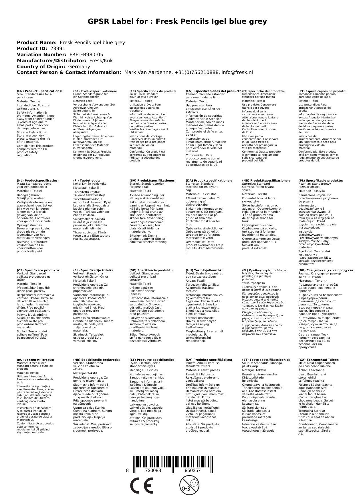 Fresk Stiftemäppchen Igel blau grau