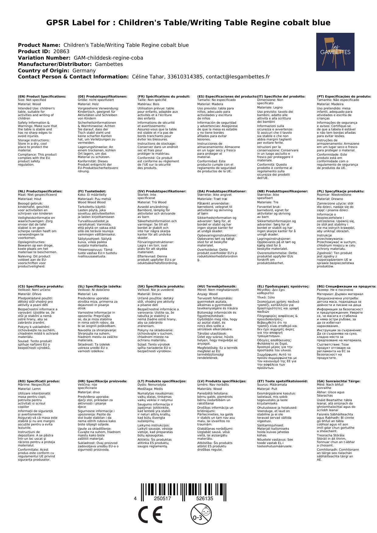 Gambettes Kindertisch/Schreibtisch Regine kobalt blau
