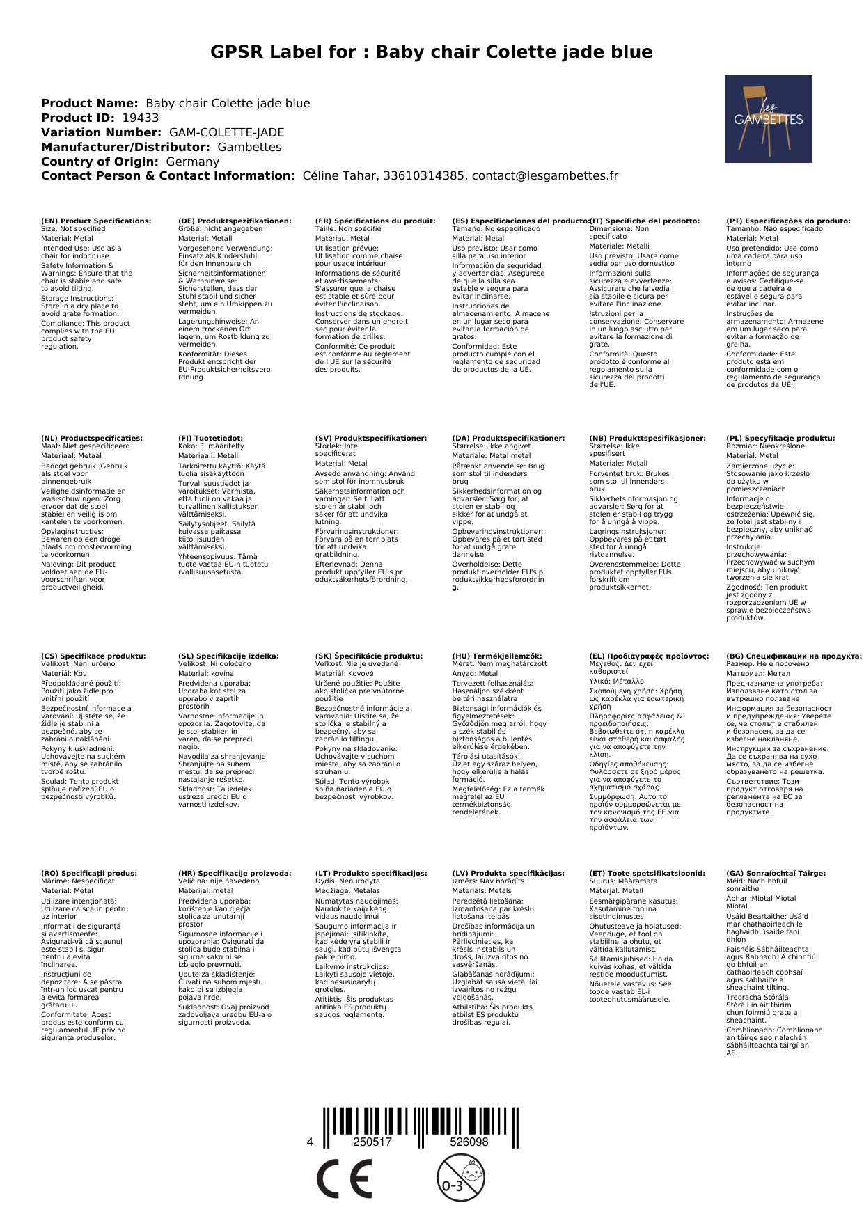 Stellen Sie eine Frage, um mehr über das Produkt zu erfahren'Bei Oma in der Küche' kommt uns in den Sinn, wenn wir diese hübschen Stühle sehen. Denn der Kinderstuhl Colette von Les Gambettes lässt uns an die Fünfziger denken - mit all Ihrem Charme.