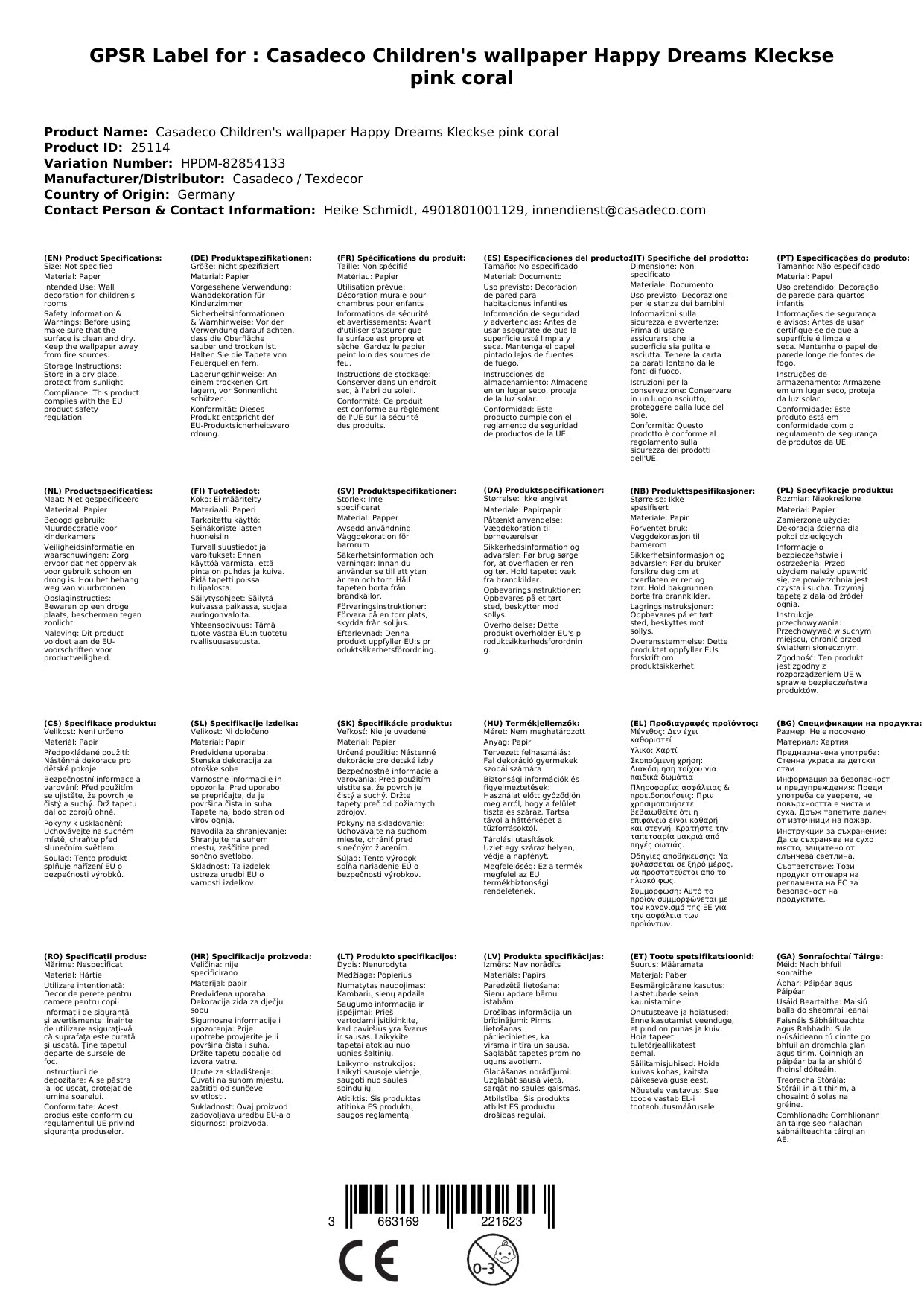 Casadeco Kindertapete Happy Dreams Kleckse rosa koralle