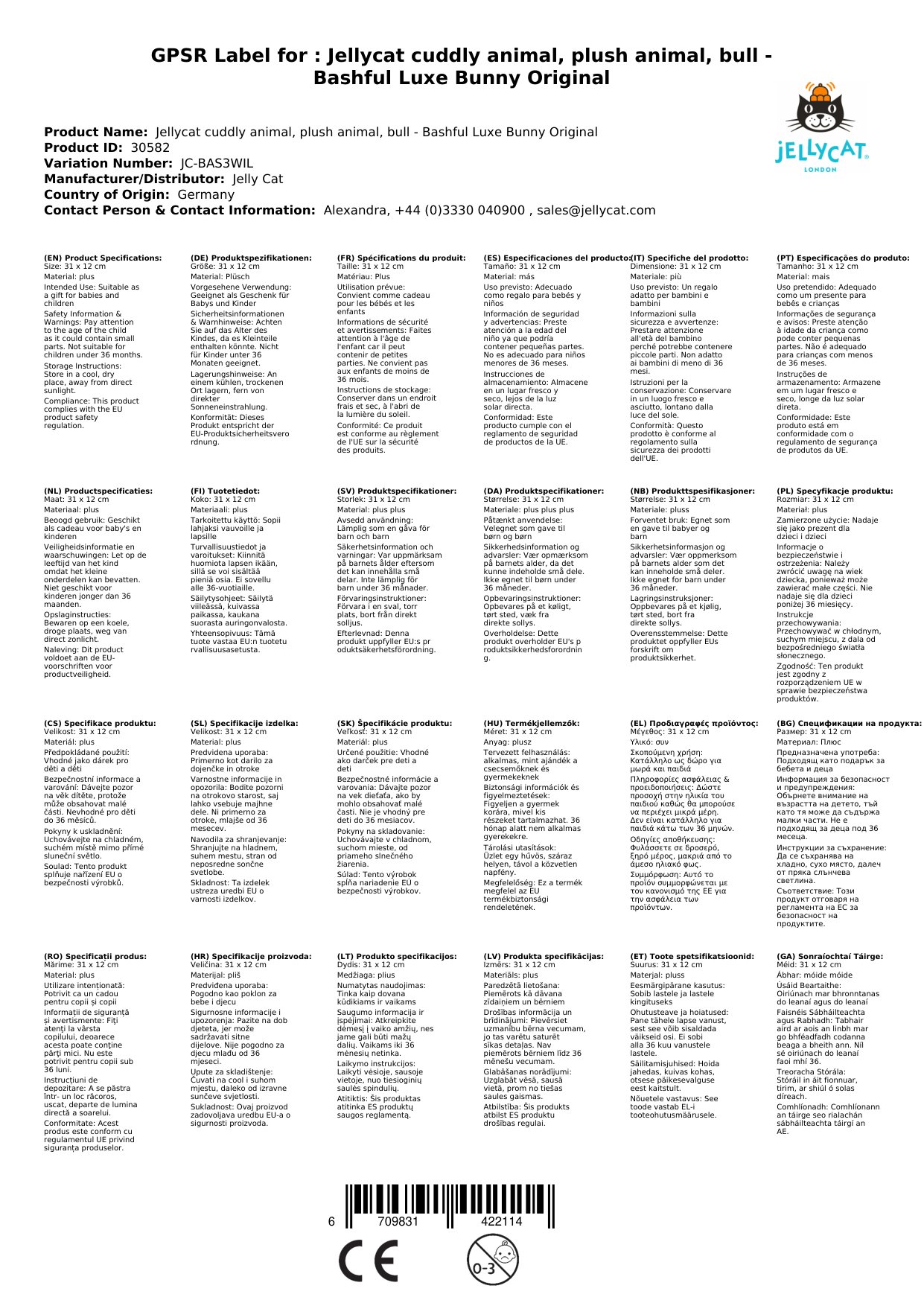 Dieser Jellycat Plüschhase ist ein wunderschönes und hochwertiges Kuscheltier für Babys und Kinder. Das außergewöhnlich weiche Fell fühlt sich leicht und luxuriös an. Der Schwanz aus langem, weichem Fell bildet einen herrlichen pflaumenartigen Pompon und die hübsche Nase hat ein exquisites, glitzerndes Fadendetail. Das Stofftier ist getestet und bestanden nach EN71 Teil 1, 2 und 3 für alle Altersgruppen. Bitte achten Sie darauf, dass das Produkt aufgrund seiner Fasern nicht für Kinder unter 12 Monaten geeignet ist. Waschen Sie den Hase nur bei 30 Grad Celsius und prüfen Sie alle Etiketten bei der Ankunft des Produkts.