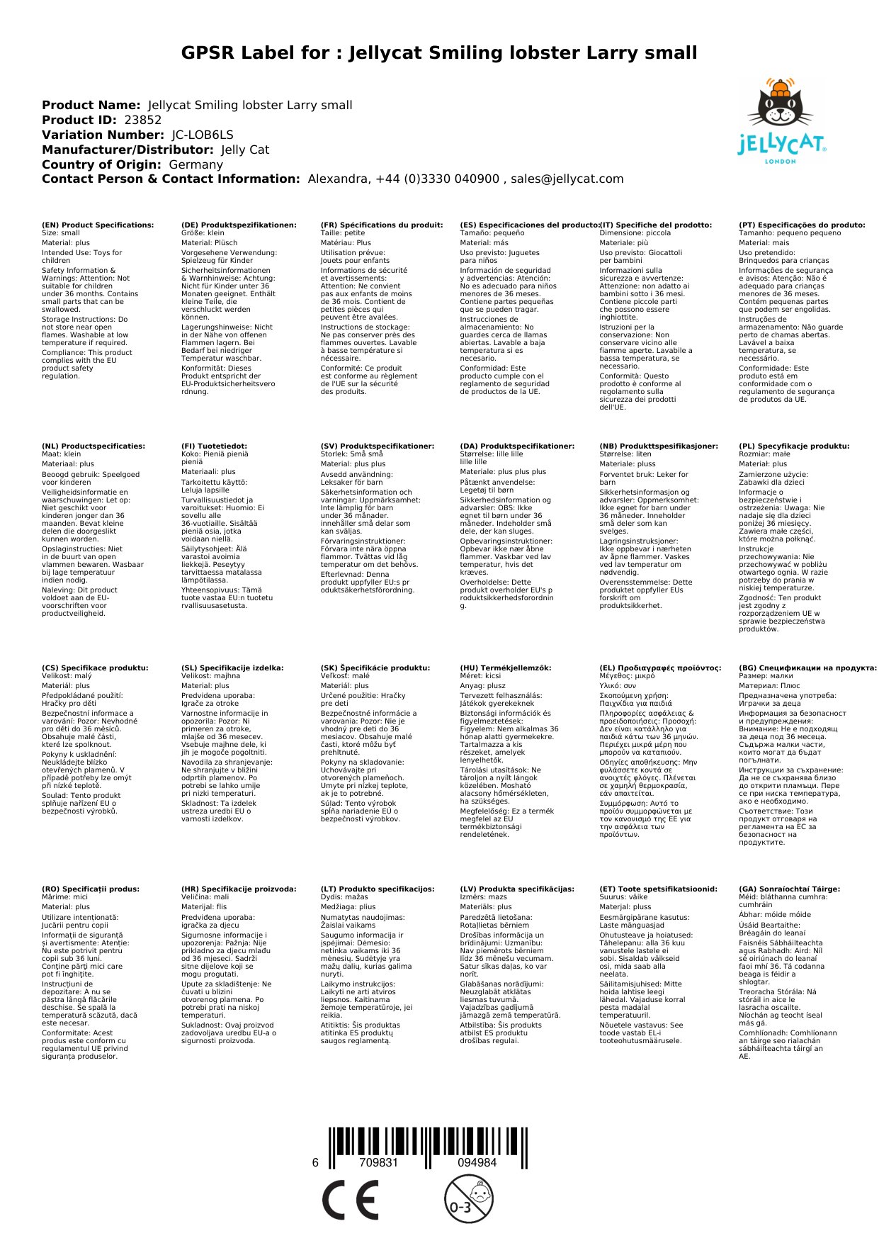 Jellycat Kuscheltier Hummer Larry klein