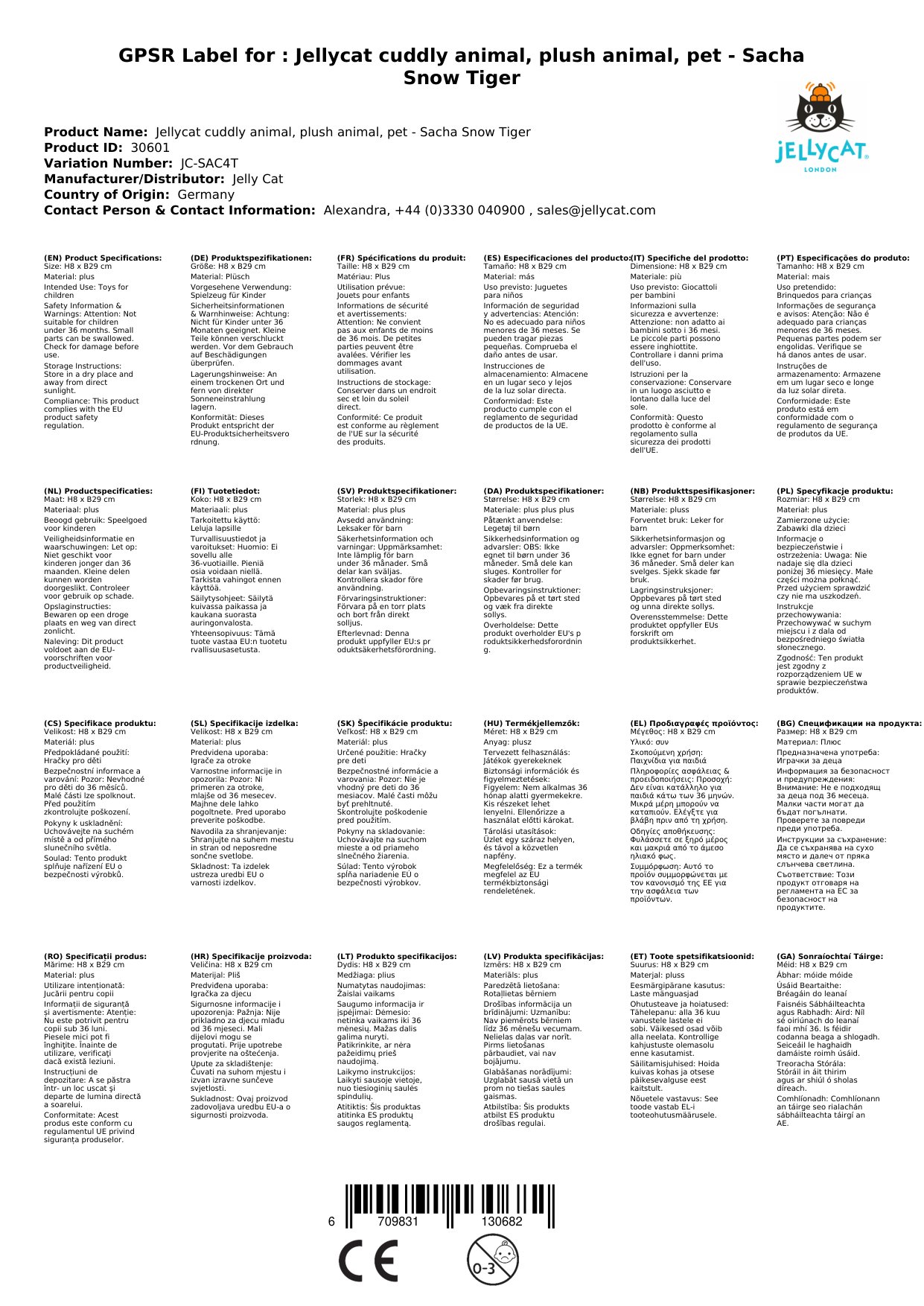 - Das Stofftier ist getestet und entspricht der europäischen Sicherheitsnorm für Spielzeug: EN71 Teile 1, 2 und 3 für alle Altersgruppen
