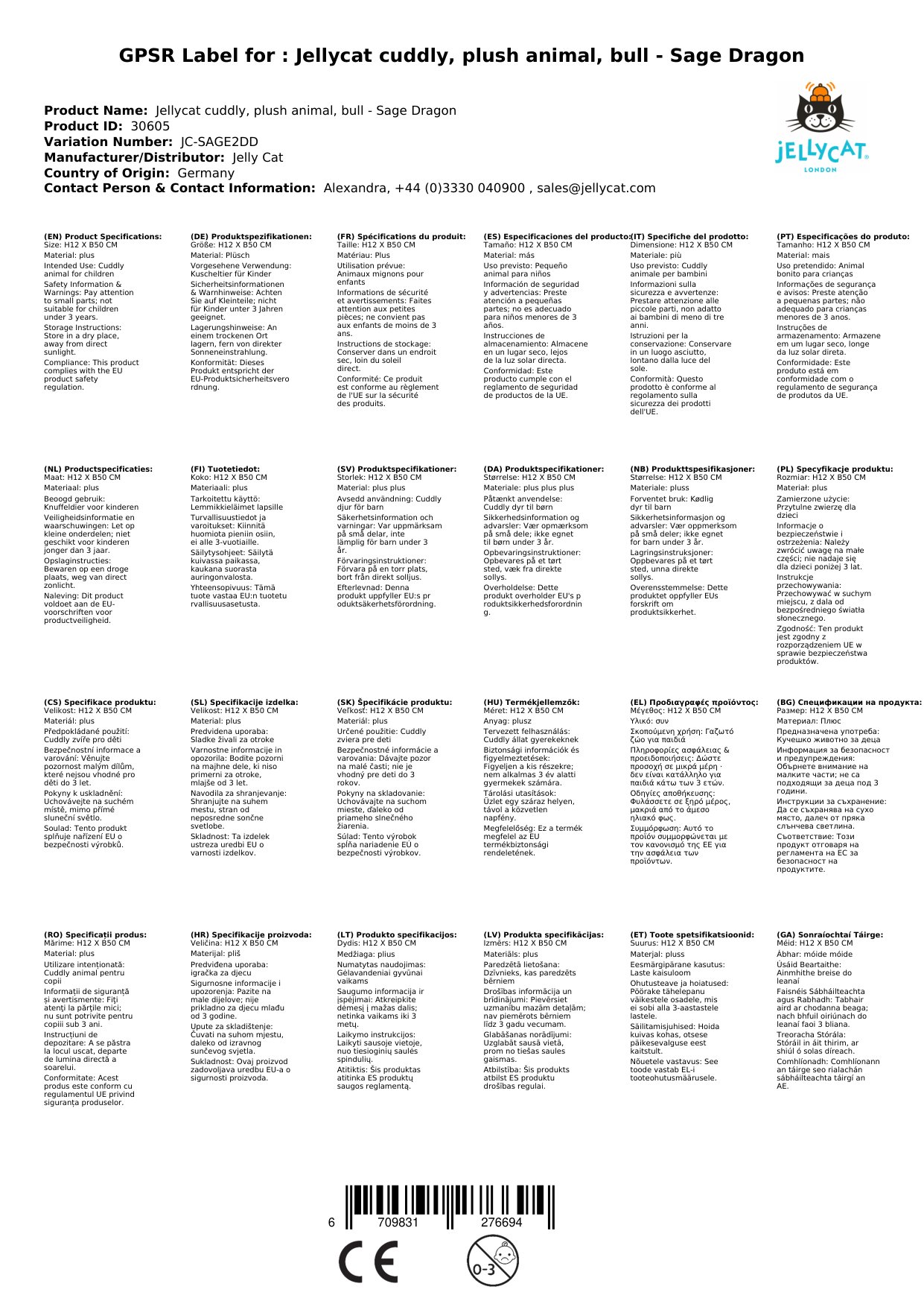 Das Jellycat Plüschtier Sage Dragon erfüllt die europäische Sicherheitsnorm EN71 Teile 1, 2 und 3 für alle Altersgruppen und eignet sich bereits ab Geburt. Bei den Größen riesig und groß sollte das Stofftier jedoch nicht in einem Kinderbett liegen gelassen werden.