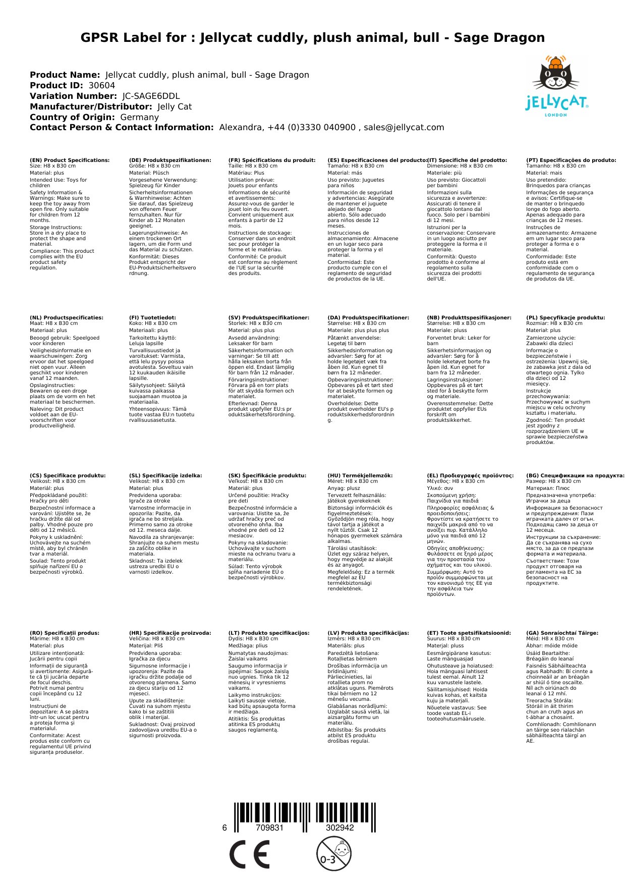 Das Jellycat Plüschtier Sage Dragon erfüllt die europäische Sicherheitsnorm EN71 Teile 1, 2 und 3 für alle Altersgruppen und eignet sich bereits ab Geburt. Bei den Größen riesig und groß sollte das Stofftier jedoch nicht in einem Kinderbett liegen gelassen werden.