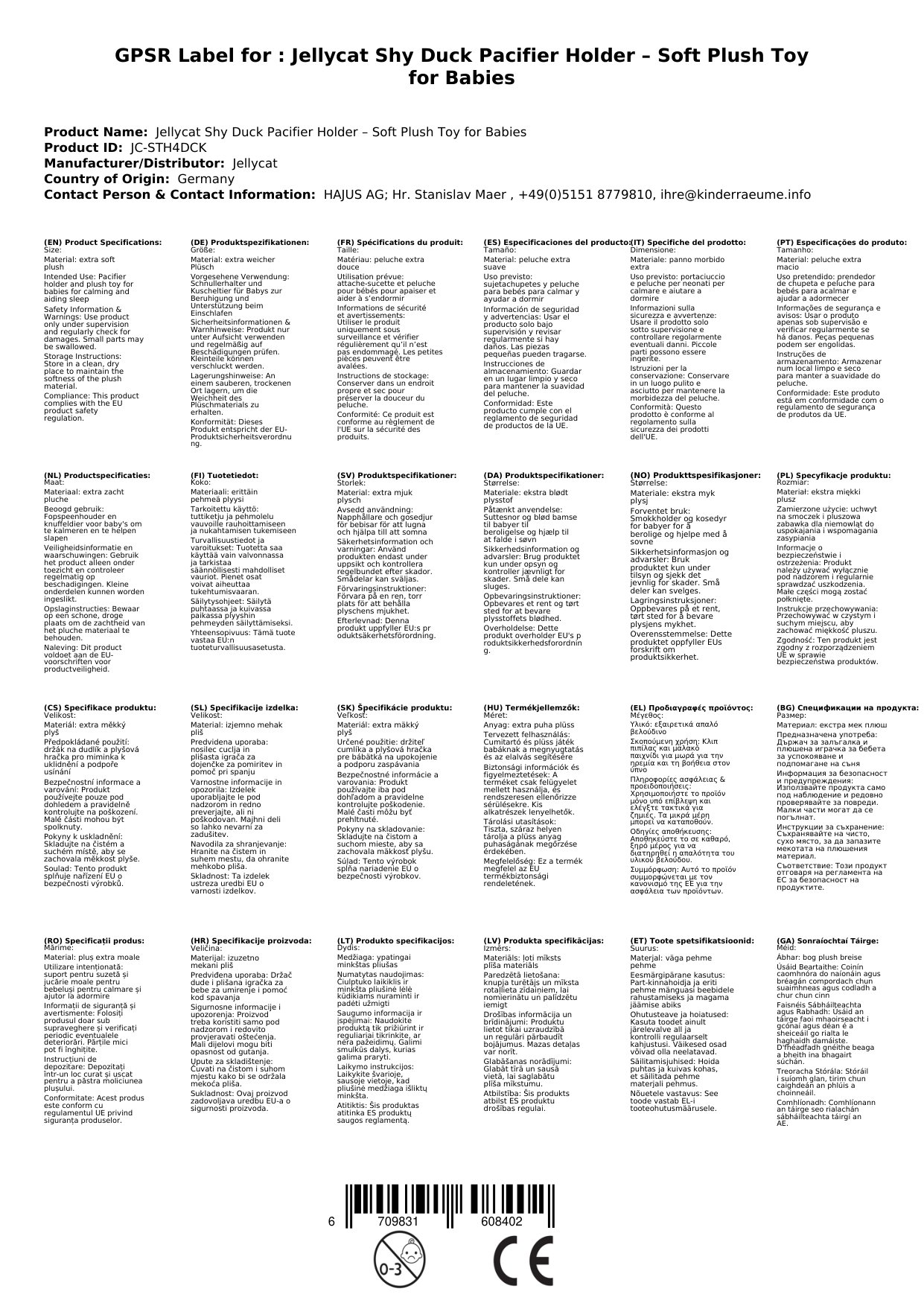 - Reinigung: Bei Bedarf können Sie das Kuscheltier von Hand oder im Schonwaschgang Ihrer Waschmaschine (in einem Wäschenetz) bei 30°C reinigen. Lassen Sie es an der Luft trocknen. Verwenden Sie keine Bleichmittel oder Trockner.
