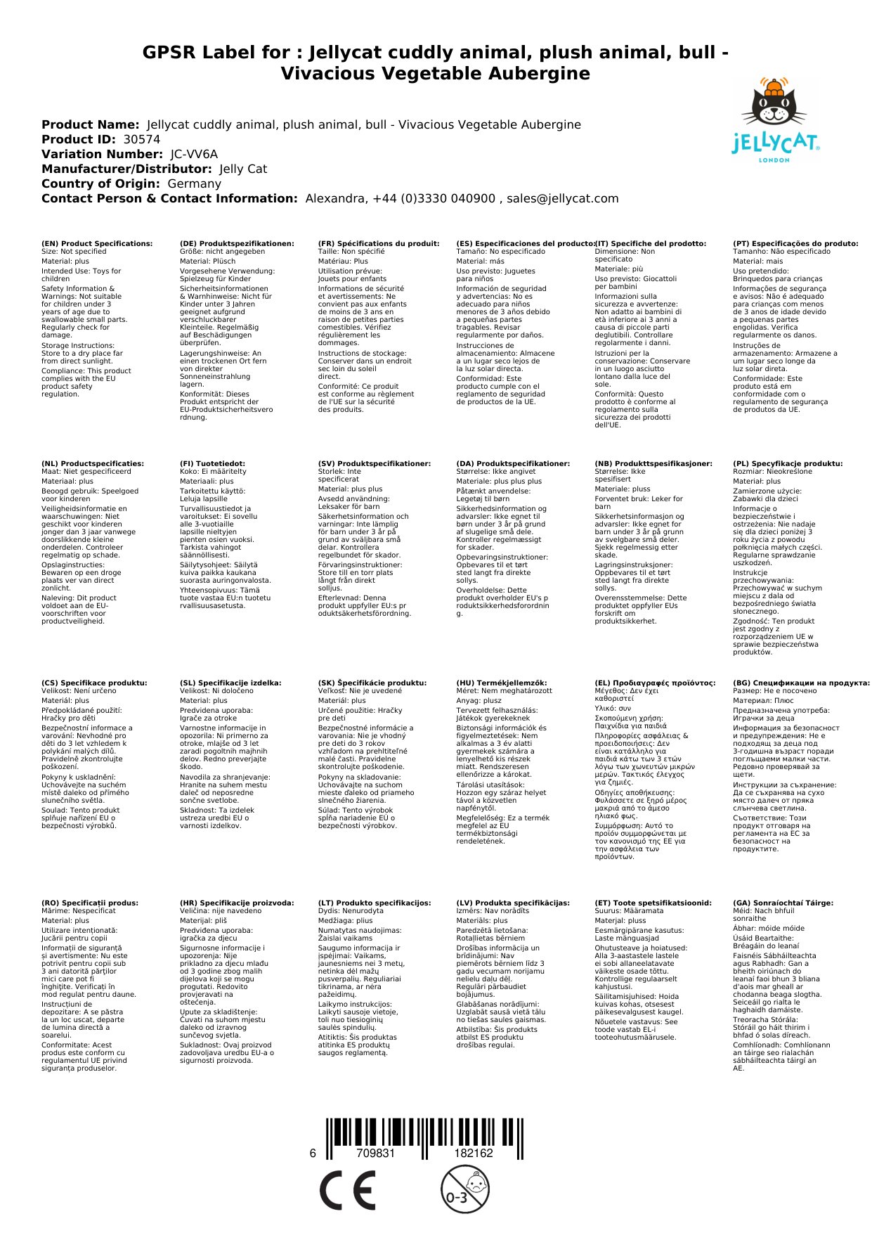 Dieses Jellycat Kuscheltier, Plüschtier, Stofftier - Vivacious Vegetable Aubergine ist ein niedliches Gemüse, das zum Kuscheln und Liebhaben da ist. Es besteht aus 95% Polyester und 5% Elastan und hat eine Größe von H17 x B8 CM. Das pflaumenfarbene Fell ist dehnbar weich und hat ein süßes, freundliches Lächeln und eine grüne Stielmütze. Die Aubergine ist prall und perfekt mit einem bohnenartigen Boden und so heiter. Es wurde getestet und erfüllt die europäische Sicherheitsnorm für Spielzeug: EN71 Teile 1, 2 und 3, für alle Altersgruppen. Es ist von Geburt an geeignet. Um dieses Stofftier zu reinigen, sollten Sie es nur von Hand waschen und nicht im Trockner trocknen, chemisch reinigen oder bügeln. Die Reinigung in der Waschmaschine wird nicht empfohlen. Bitte überprüfen Sie beim Eintreffen des Kaufs alle Etiketten.
