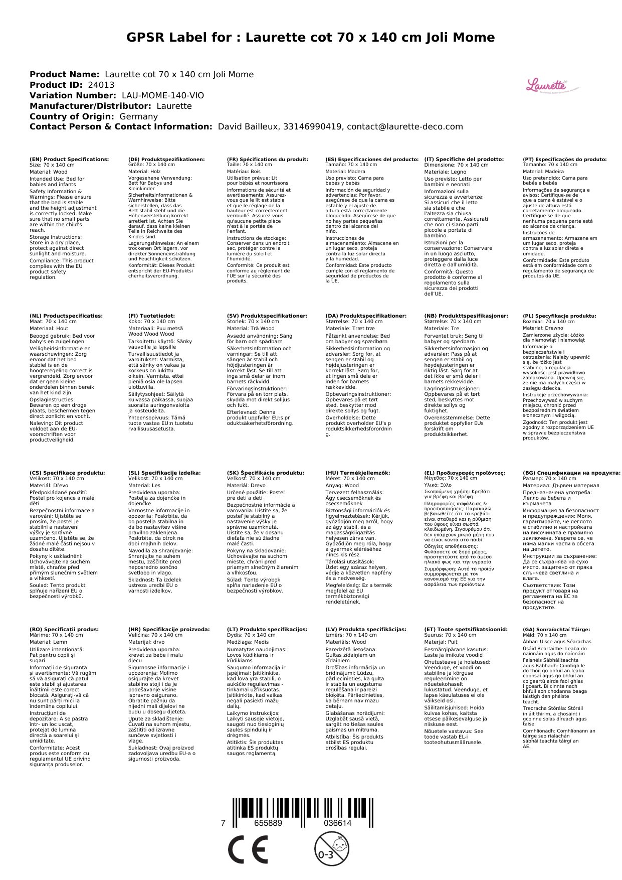 Laurette Babybett 70 x 140 cm Joli Mome, Farbe: lila