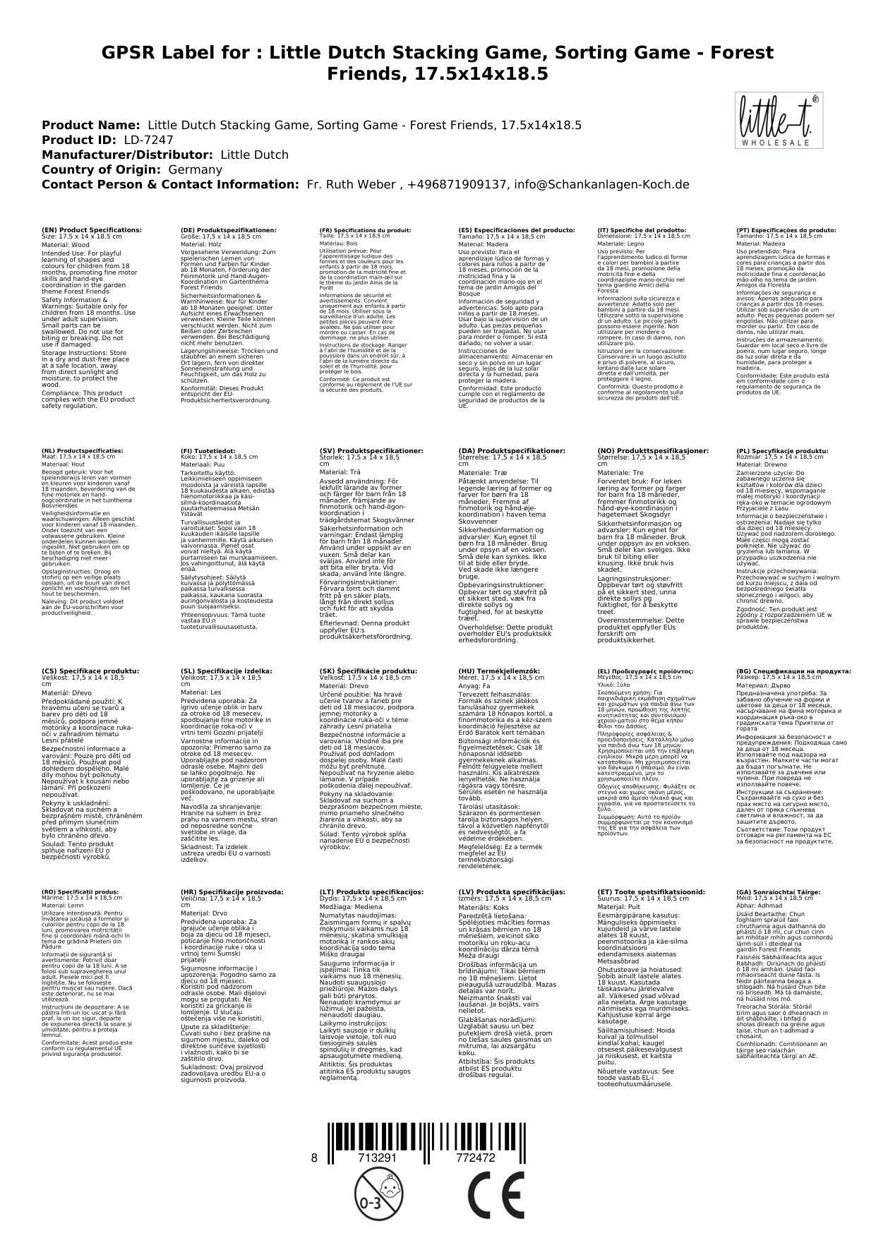 Stellen Sie eine Frage, um mehr über das Produkt zu erfahrenLittle Dutch Steckspiel, Sortierspiel - Forest Friends, 17,5x14x18,5