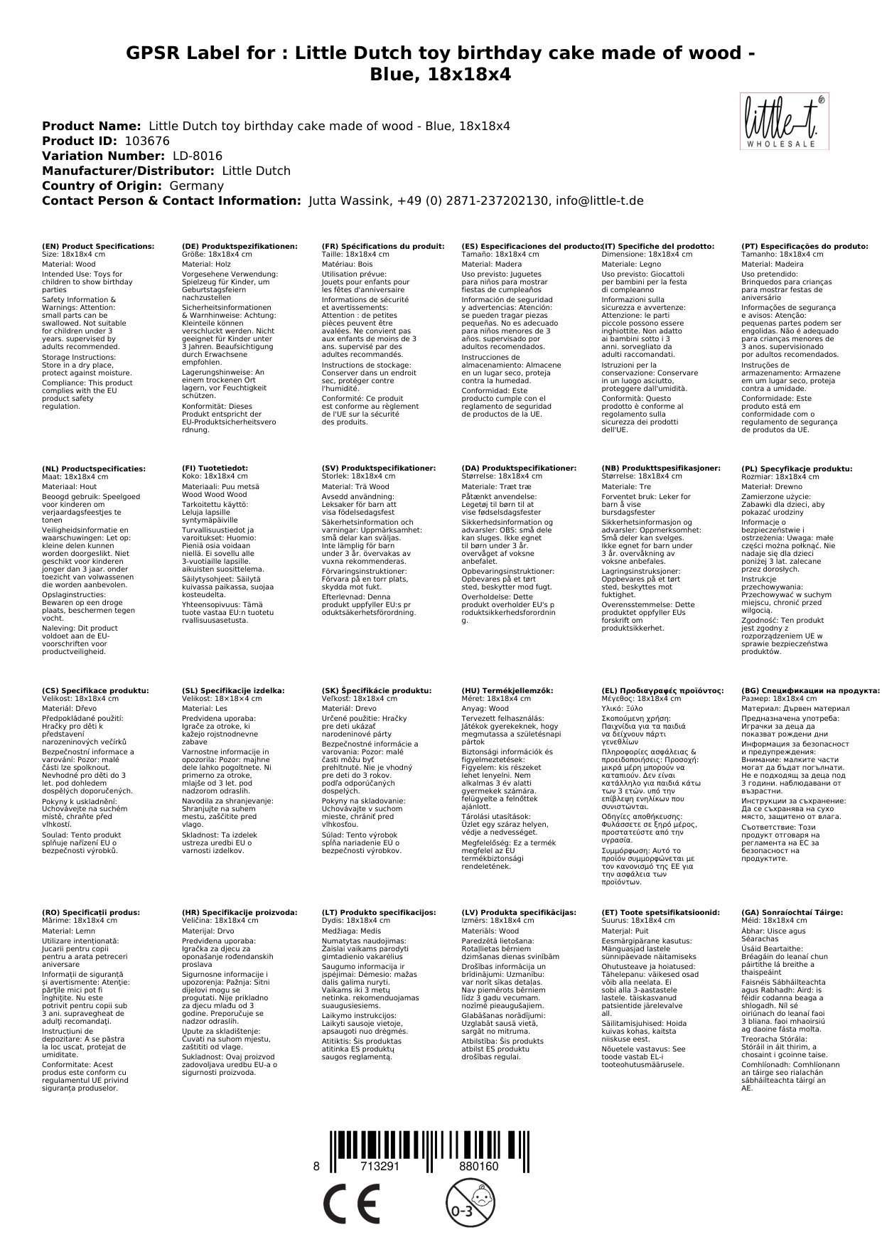 Stellen Sie eine Frage, um mehr über das Produkt zu erfahrenLittle Dutch Spielzeug Geburtstagstorte aus Holz - Blau, 18x18x4