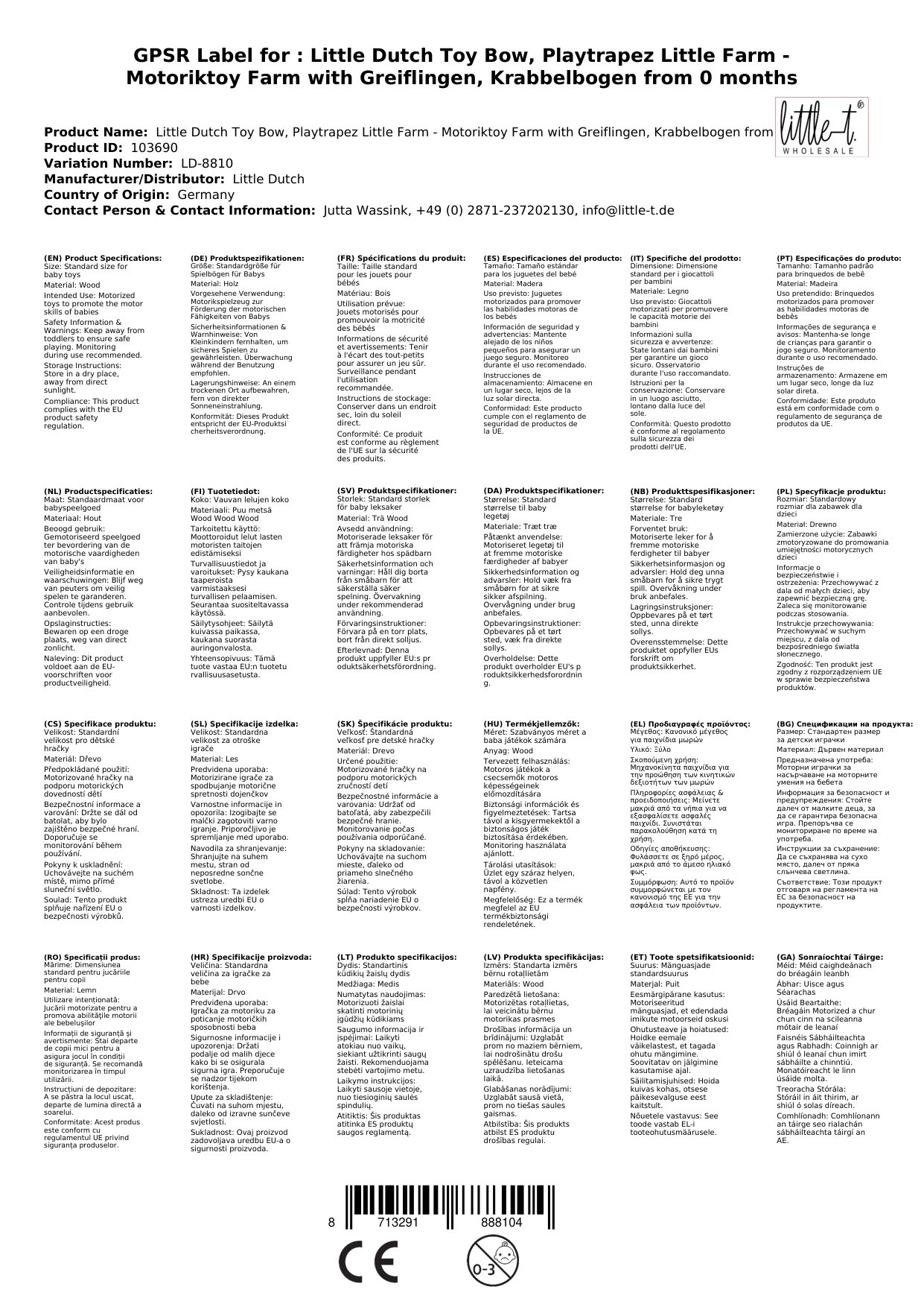 Das Spielzeug ist Teil der Little Farm Kollektion von Little Dutch und entspricht den Standards EN-71-1-2-3. Die Größe des Produkts beträgt 47,5x54x59,5 cm und ist für Kinder im Alter von 0-6 Monaten geeignet. Die Farbe des Babygymnastiks ist Grün und es besteht aus Sperrholz mit einer Farbe auf Wasserbasis. Die Spielzeuge sind aus Polyester hergestellt.
