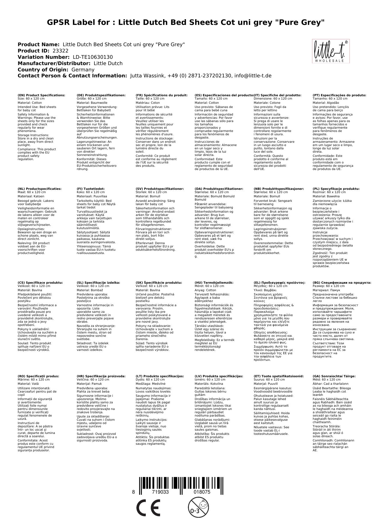 Little Dutch Bettlaken Babybett uni grau "Pure Grey", Größe: 60 x 120 cm