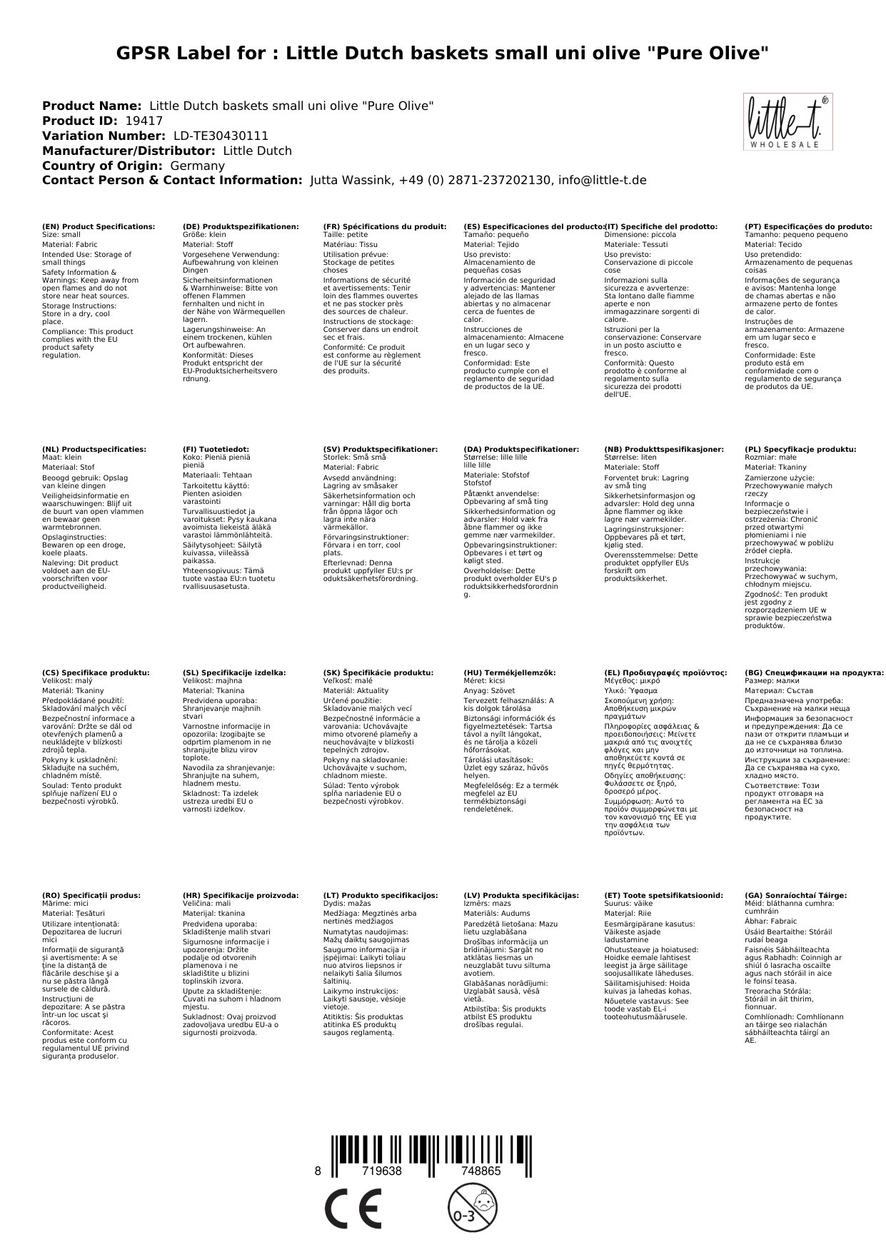 Little Dutch Körbchen klein uni oliv "Pure Olive"