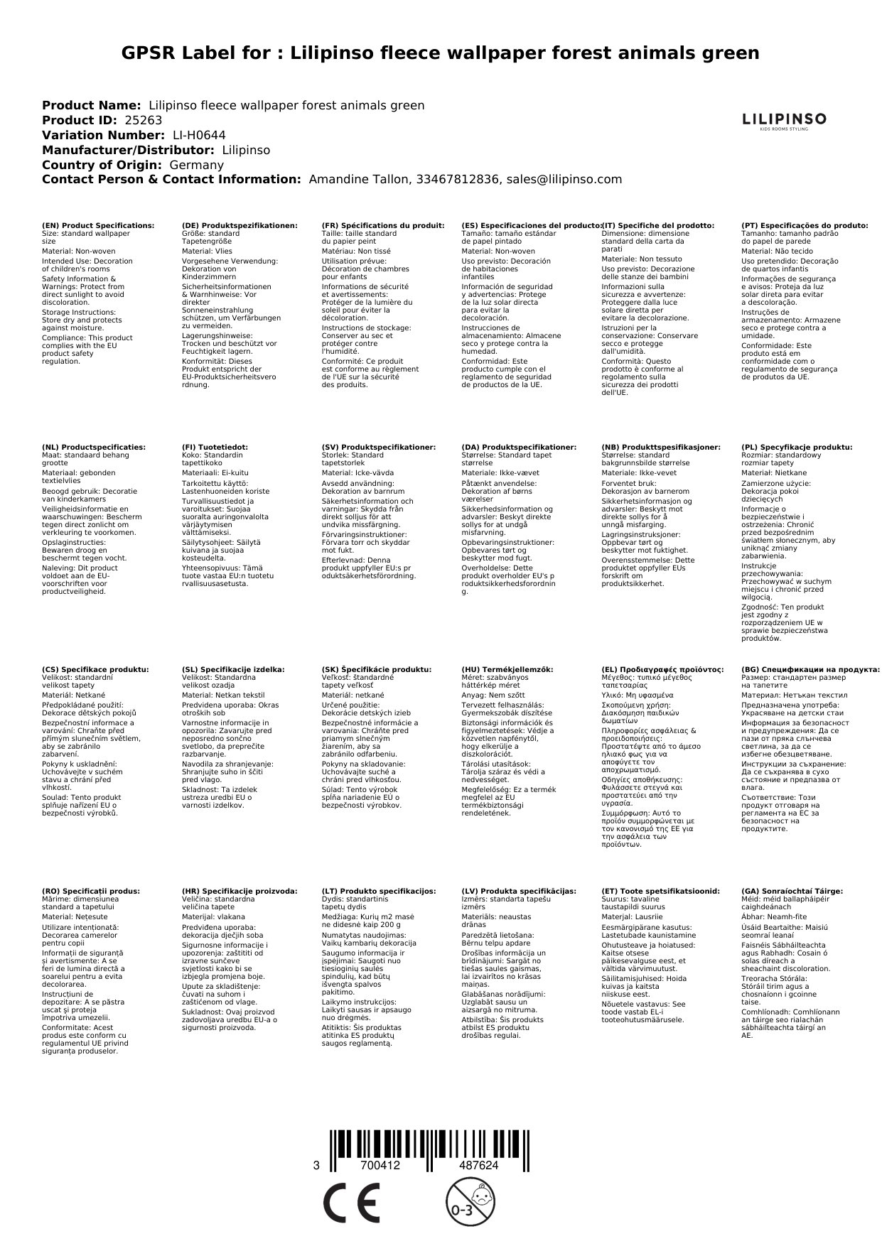 Die Tapete wird für Sie in Frankreich bei Lilipinso bestellt, wenn sie bei uns nicht vorrätig ist. Wir verpacken sie liebevoll für Sie und lassen Sie mittels einer Mail wissen, sobald das Paket unser Lager verlässt.