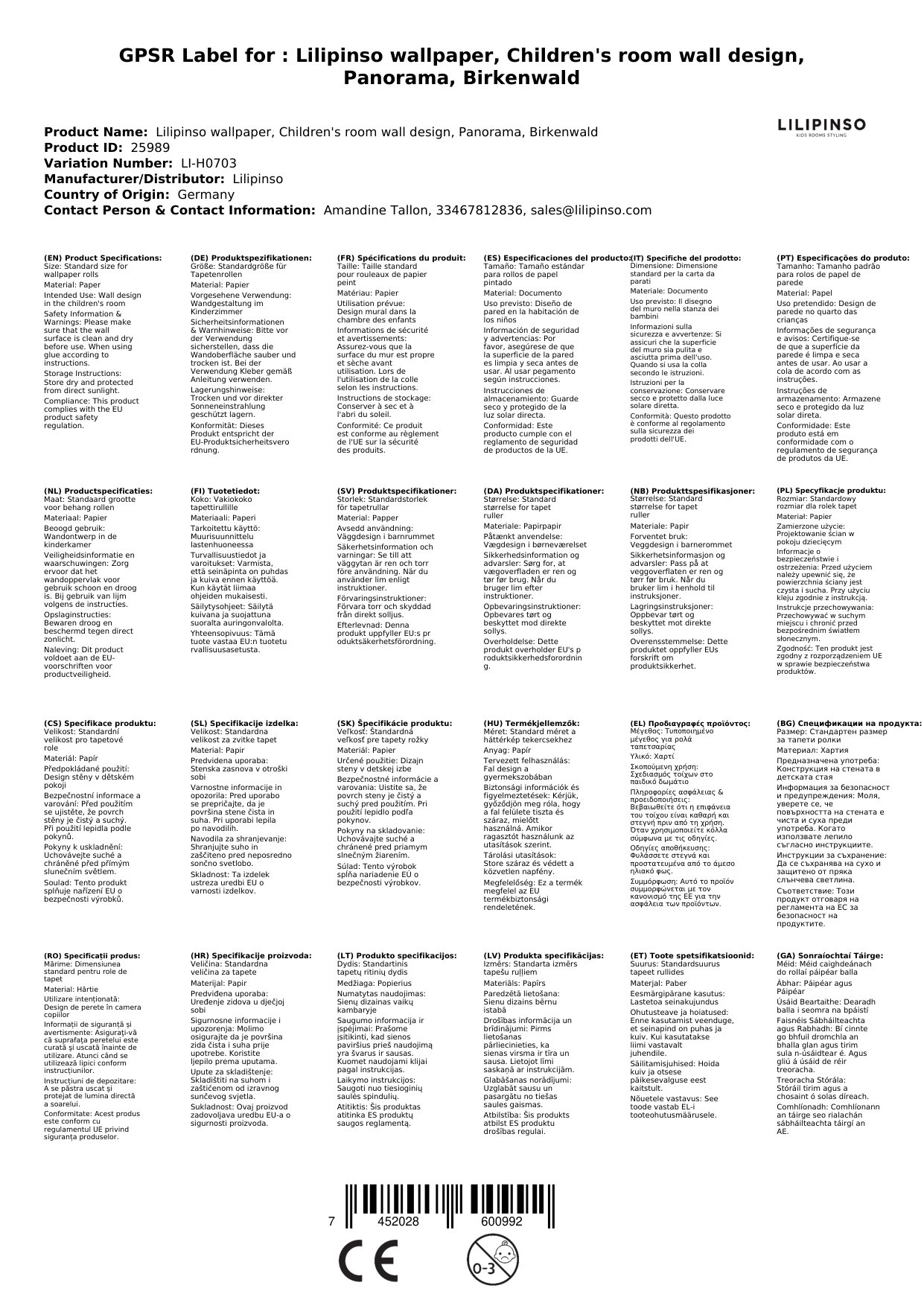 Die Tapete wird für Sie in Frankreich bei Lilipinso bestellt, wenn sie bei uns nicht vorrätig ist. Wir verpacken sie liebevoll für Sie und lassen Sie mittels einer Mail wissen, sobald das Paket unser Lager verlässt. Ein Link hilft Ihnen dabei, die Sendung zu verfolgen. Die aktuelle Lieferzeit ist oben neben den Produktfotos angegeben.