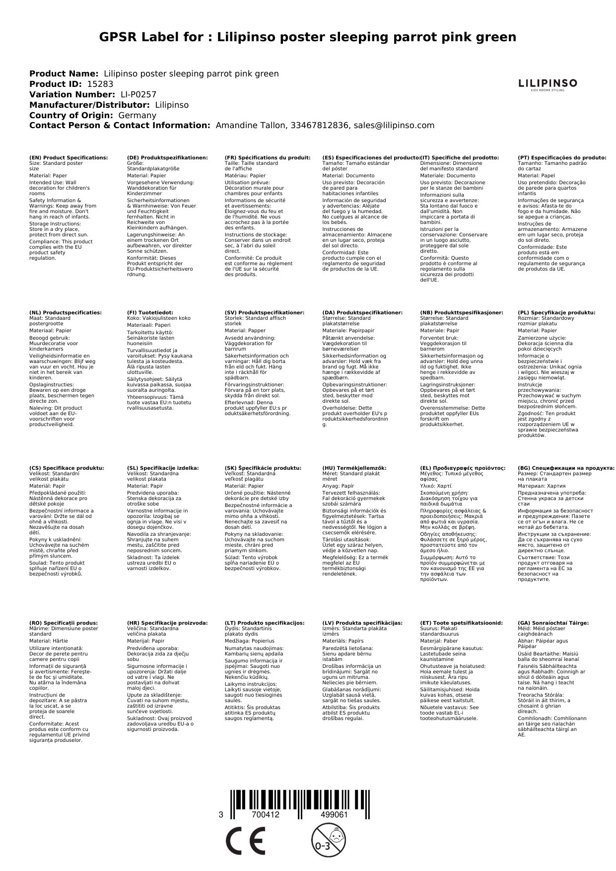 Das Poster wird für Sie in Frankreich bei Lilipinso bestellt, wenn es bei uns nicht vorrätig ist. Wir verpacken es liebevoll für Sie und lassen Sie mittels einer Mail wissen, sobald das Paket unser Lager verlässt.