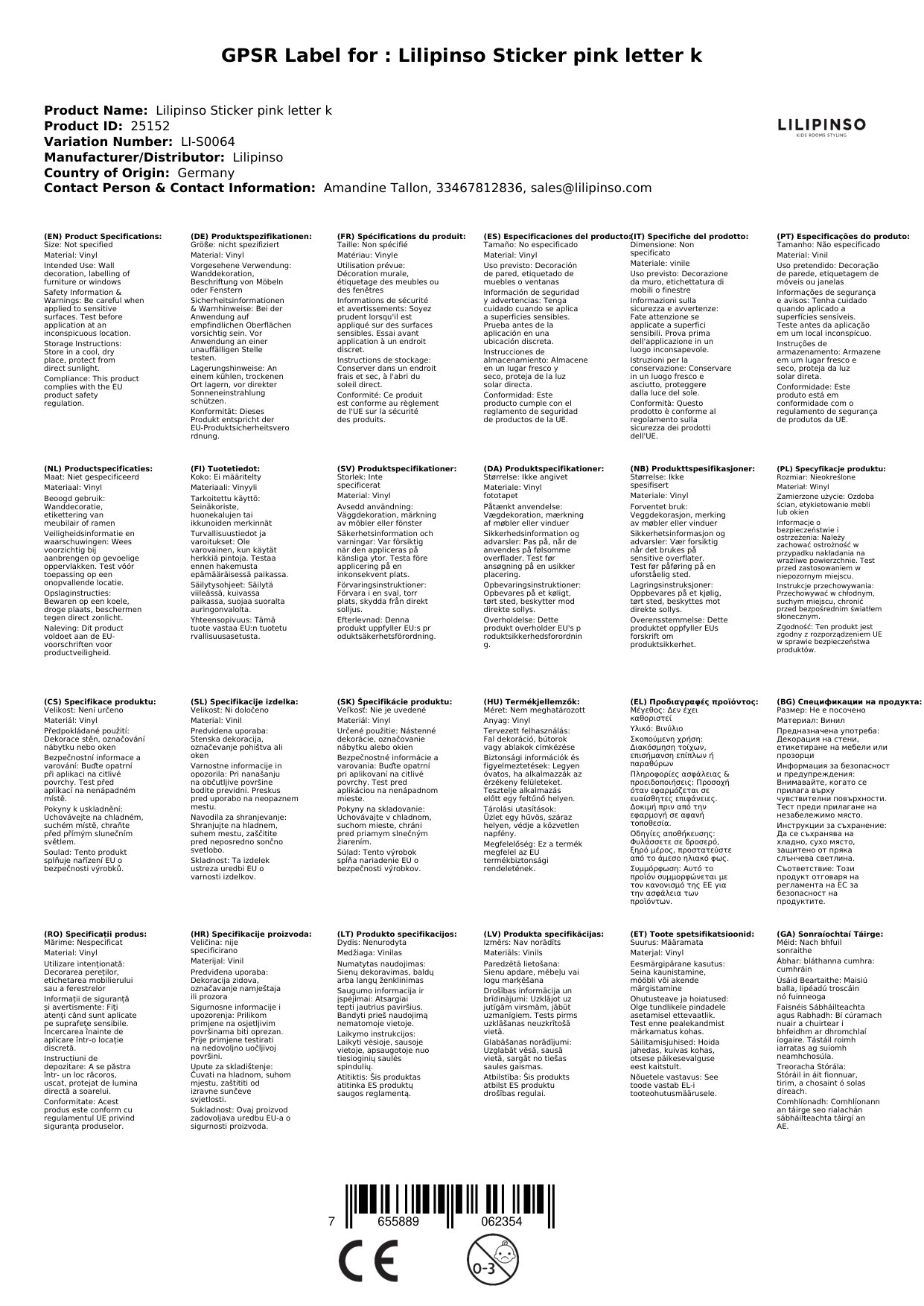 | hier sehen sie den wandsticker buchstabe 'k' von lilipinso in rosa. eine schöne dekorationsidee. schreiben sie ihren namen oder irgendetwas anderes auf wand, möbel oder scheibe. alle buchstaben des alphabetes sind unterschiedlich gestaltet sodass sie bei mehreren buchstaben ein schönes und individuelles gesamtbild erhalten. aber auch als einzelobjekt sind diese zeichen eine schöne idee. aus dem alphabet sind alle buchstaben sowohl in rosa als auch blau hier im internetladen erhältlich. | | - vinyl - 1 buchstabe - ca. 9 x 10 cm |