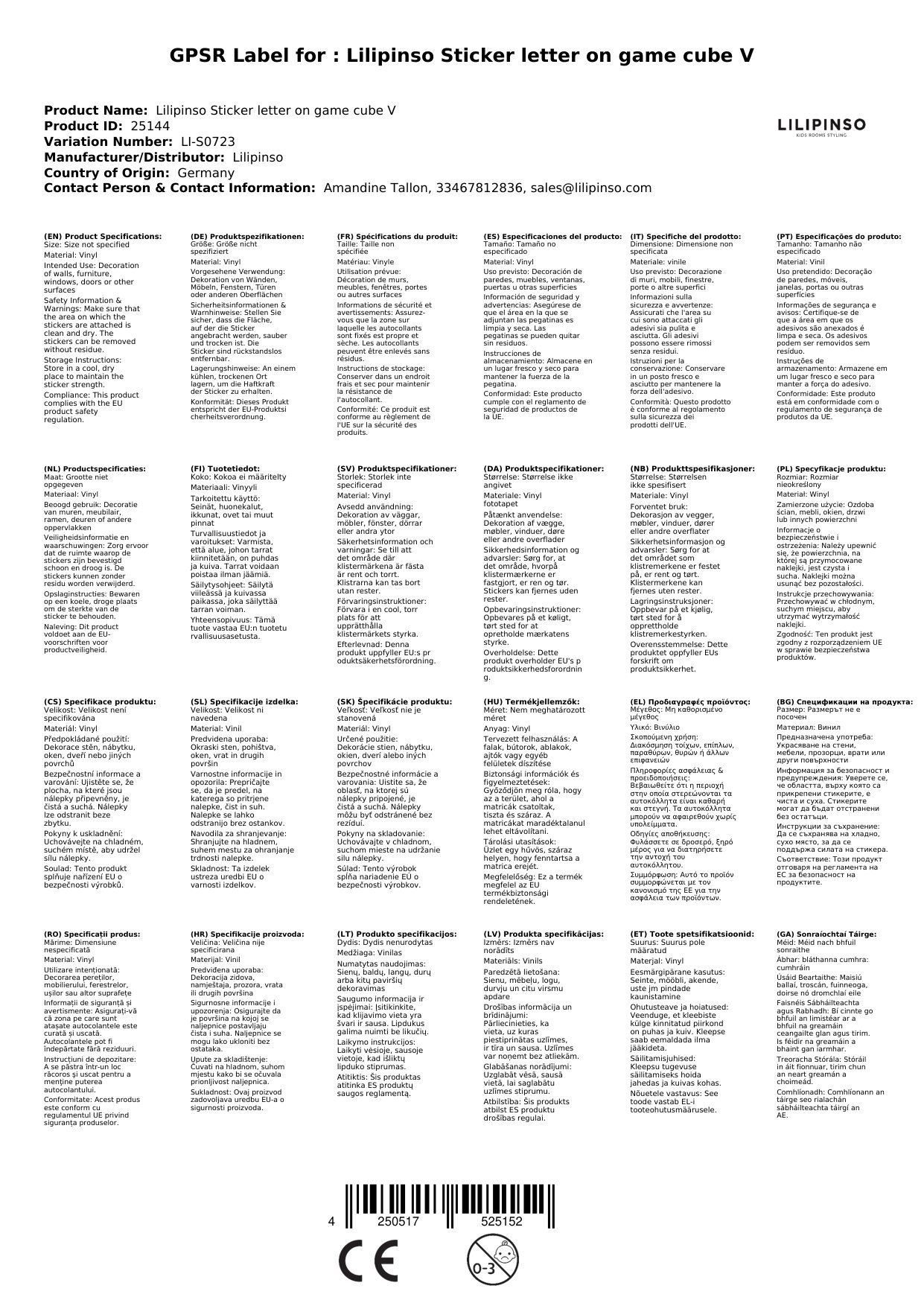 Der Sticker wird für Sie in Frankreich bei Lilipinso bestellt, wenn er bei uns nicht auf Lager ist.