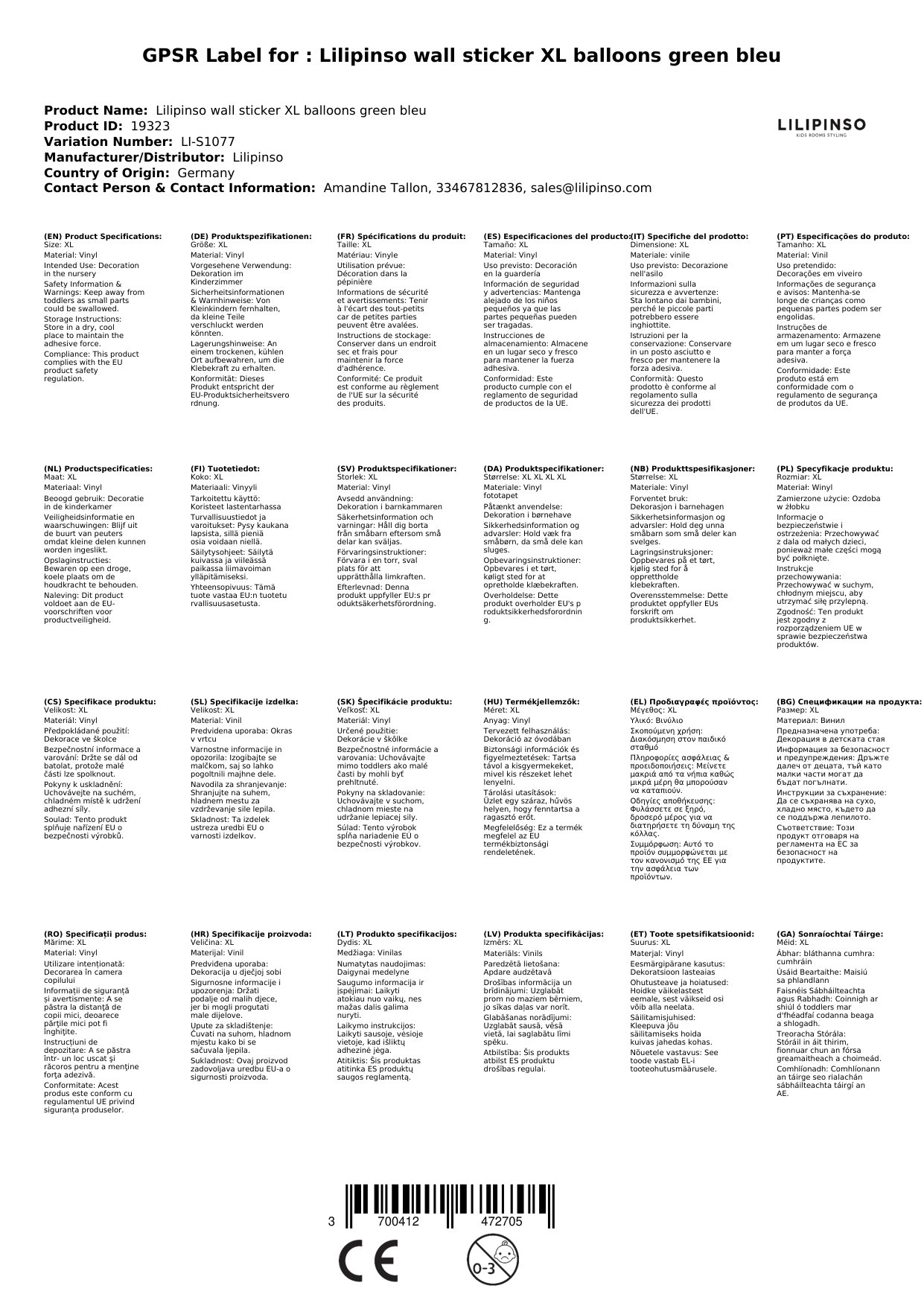 Stellen Sie eine Frage, um mehr über das Produkt zu erfahrenHier sehen Sie einen hübschen Wandsticker von Lilipinso aus Frankreich. Damit können Sie einen wundervollen Akzent im Kinderzimmer setzen. Durch seine Größe ist er ein zauberhafter Blickfang. Natürlich wirkt der Sticker auch alleine, aber ganz besonders schön ist er in Kombination mit den famosen passenden Dekoartikeln des Herstellers.