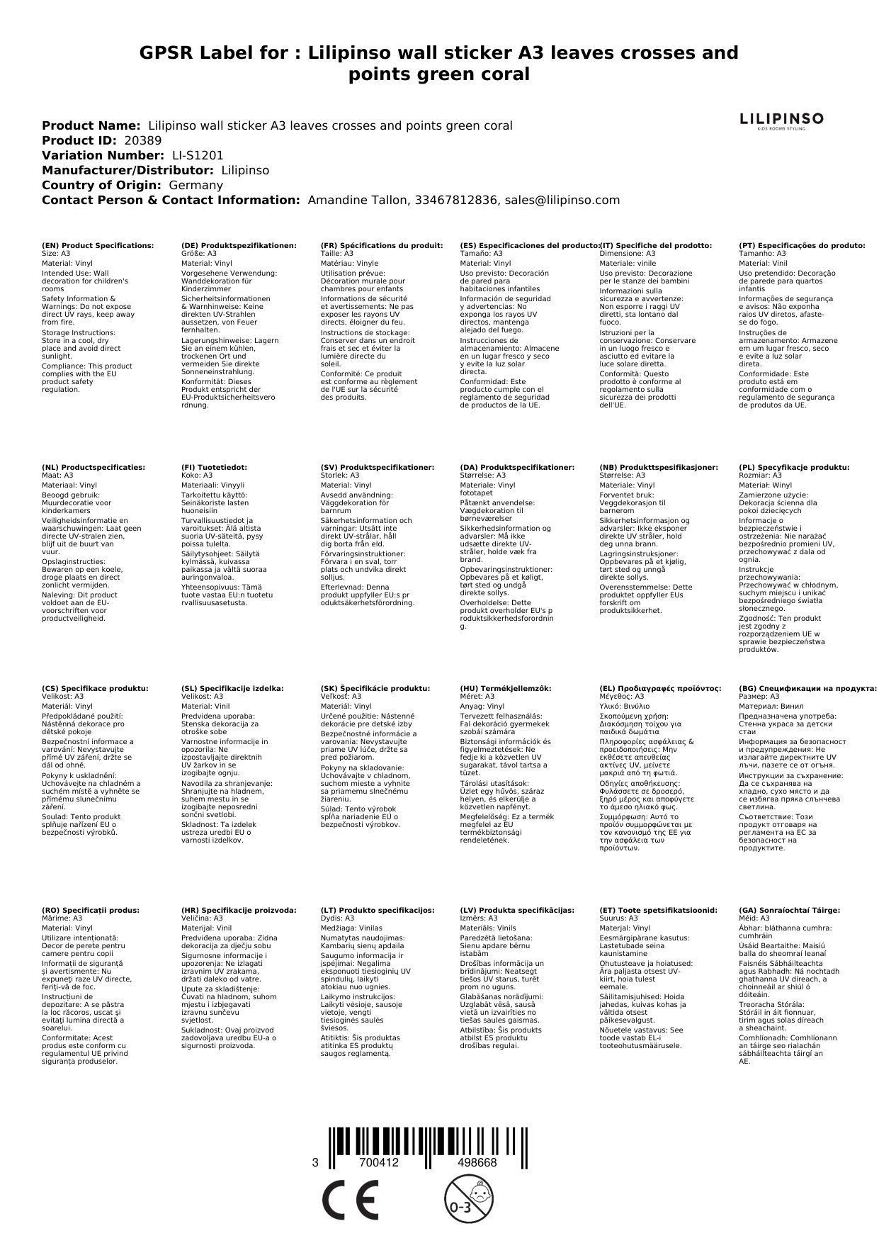 Die Sticker werden für Sie in Frankreich bei Lilipinso bestellt, wenn sie bei uns nicht vorrätig sind. Wir verpacken sie liebevoll für Sie und lassen Sie mittels einer Mail wissen, sobald das Paket unser Lager verlässt.