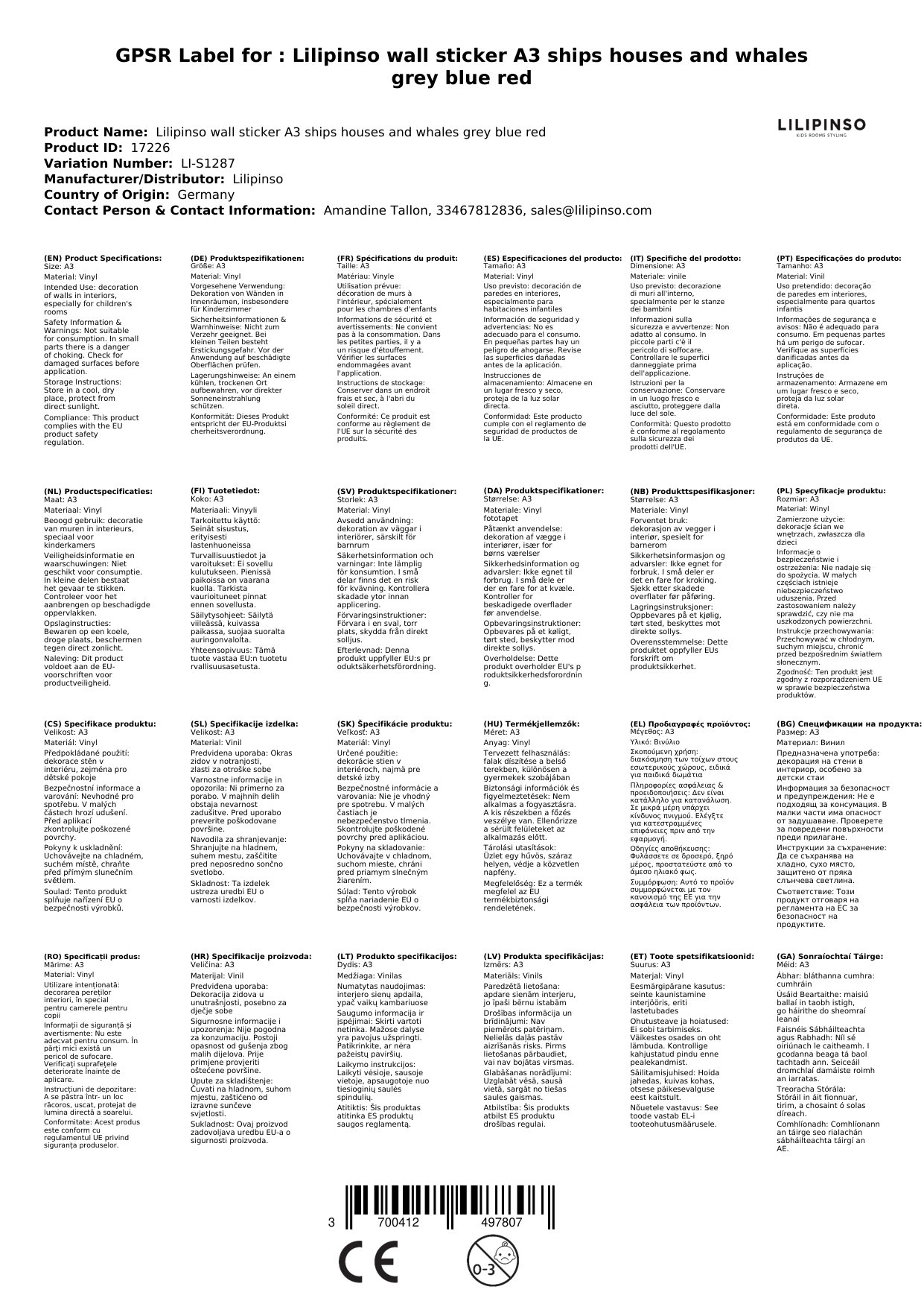 Lilipinso Wandsticker A3 Schiffe Häuser und Wale grau blau rot