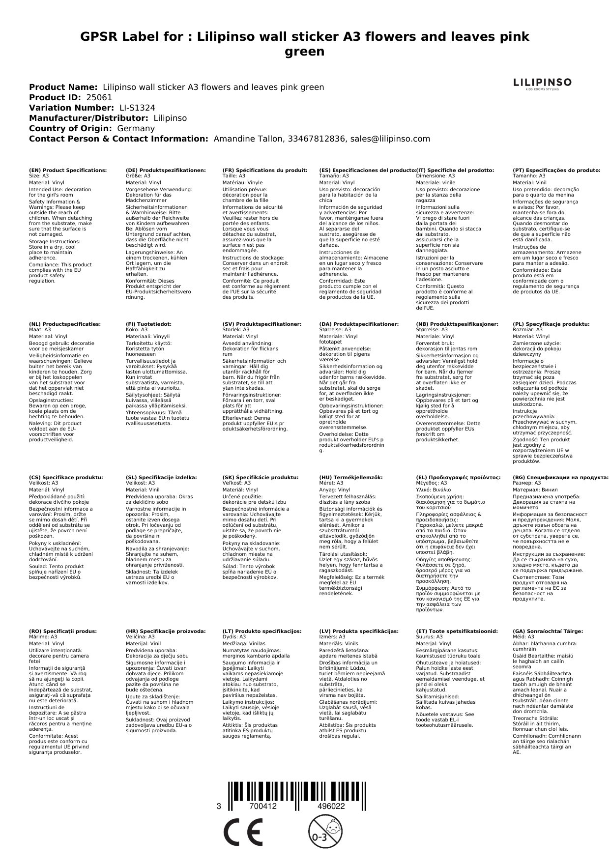 Die Sticker werden für Sie in Frankreich bei Lilipinso bestellt, wenn sie bei uns nicht vorrätig sind. Wir verpacken sie liebevoll für Sie und lassen Sie mittels einer Mail wissen, sobald das Paket unser Lager verlässt.