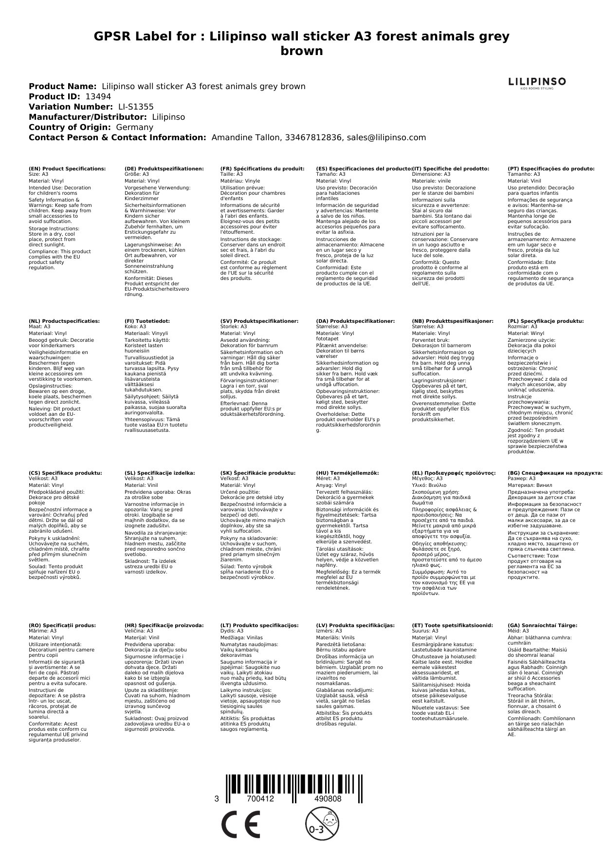 Lilipinso Wandsticker A3 Waldtiere grau braun