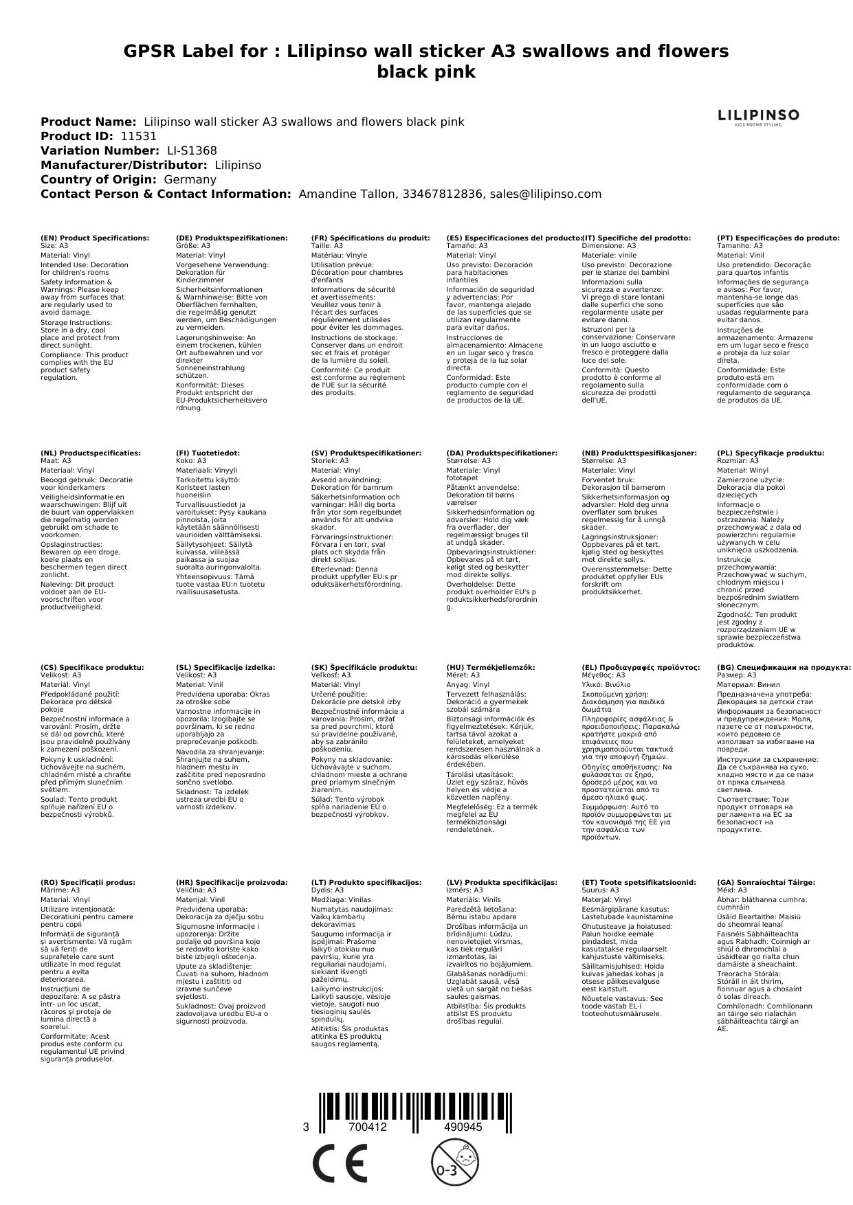 Lilipinso Wandsticker A3 Schwalben und Blüten schwarz rosa