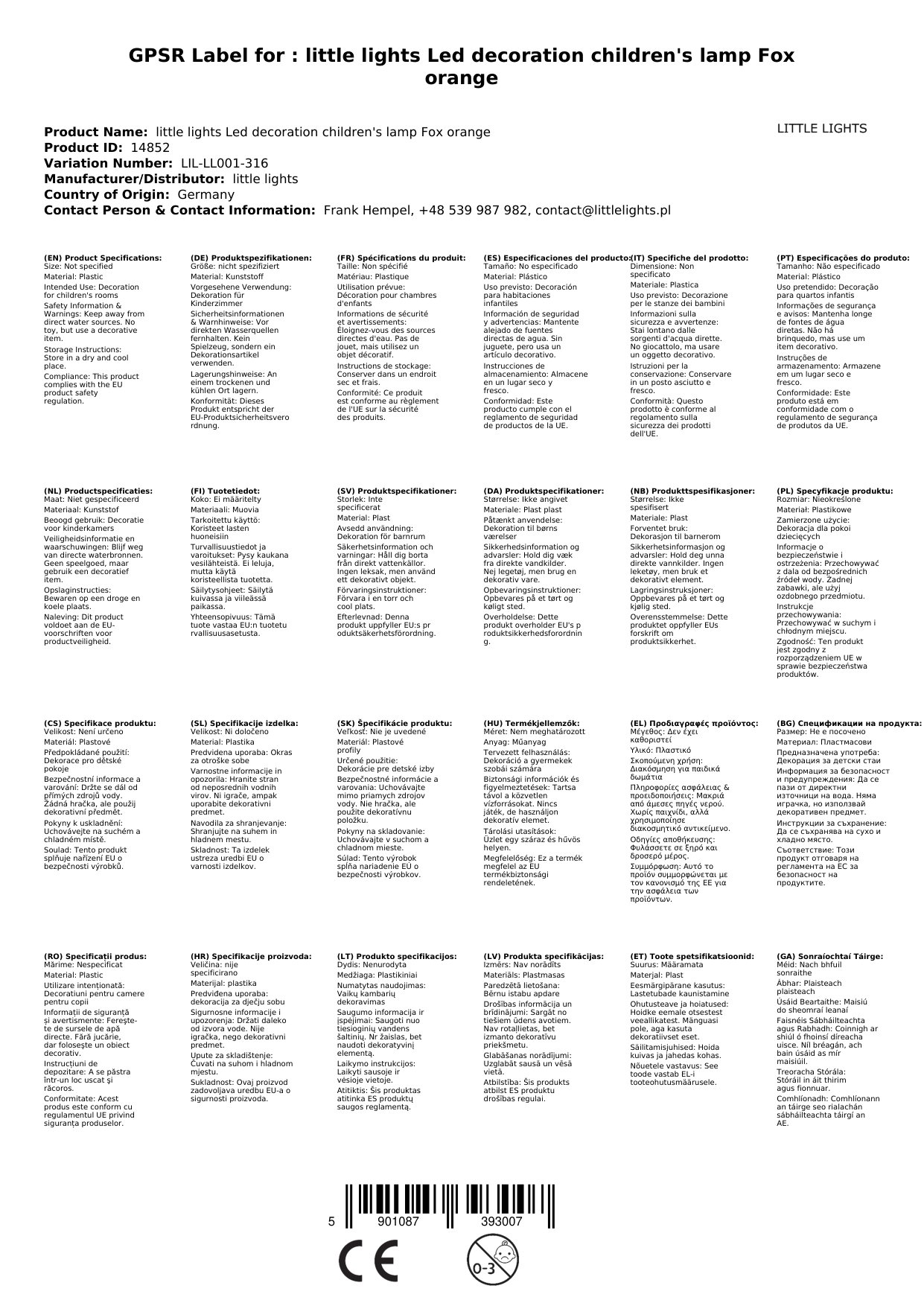 little lights Led Deko Kinderlampe Fuchs orange