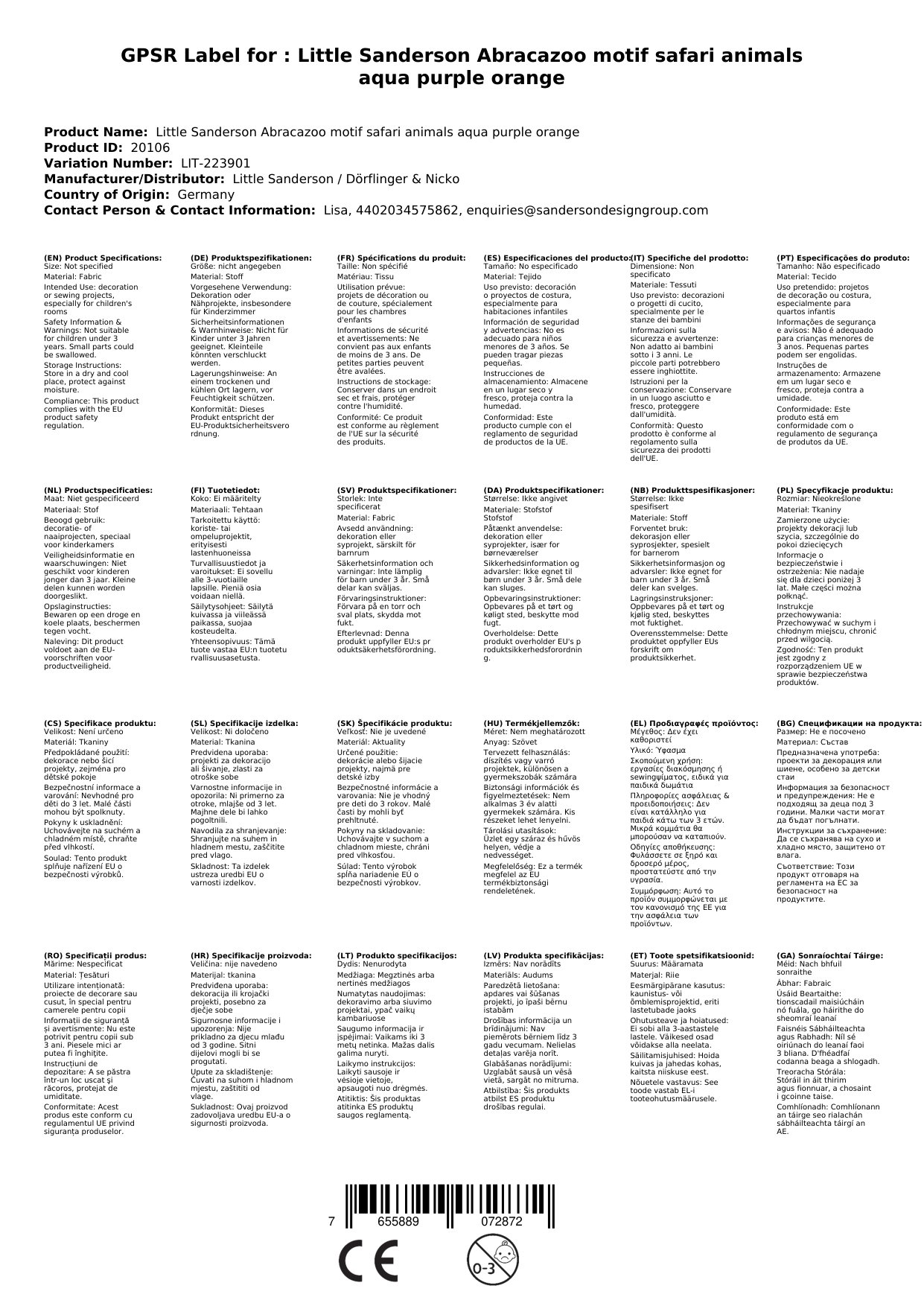 Little Sanderson Abracazoo Motivstoff Safari Tiere aqua lila orange